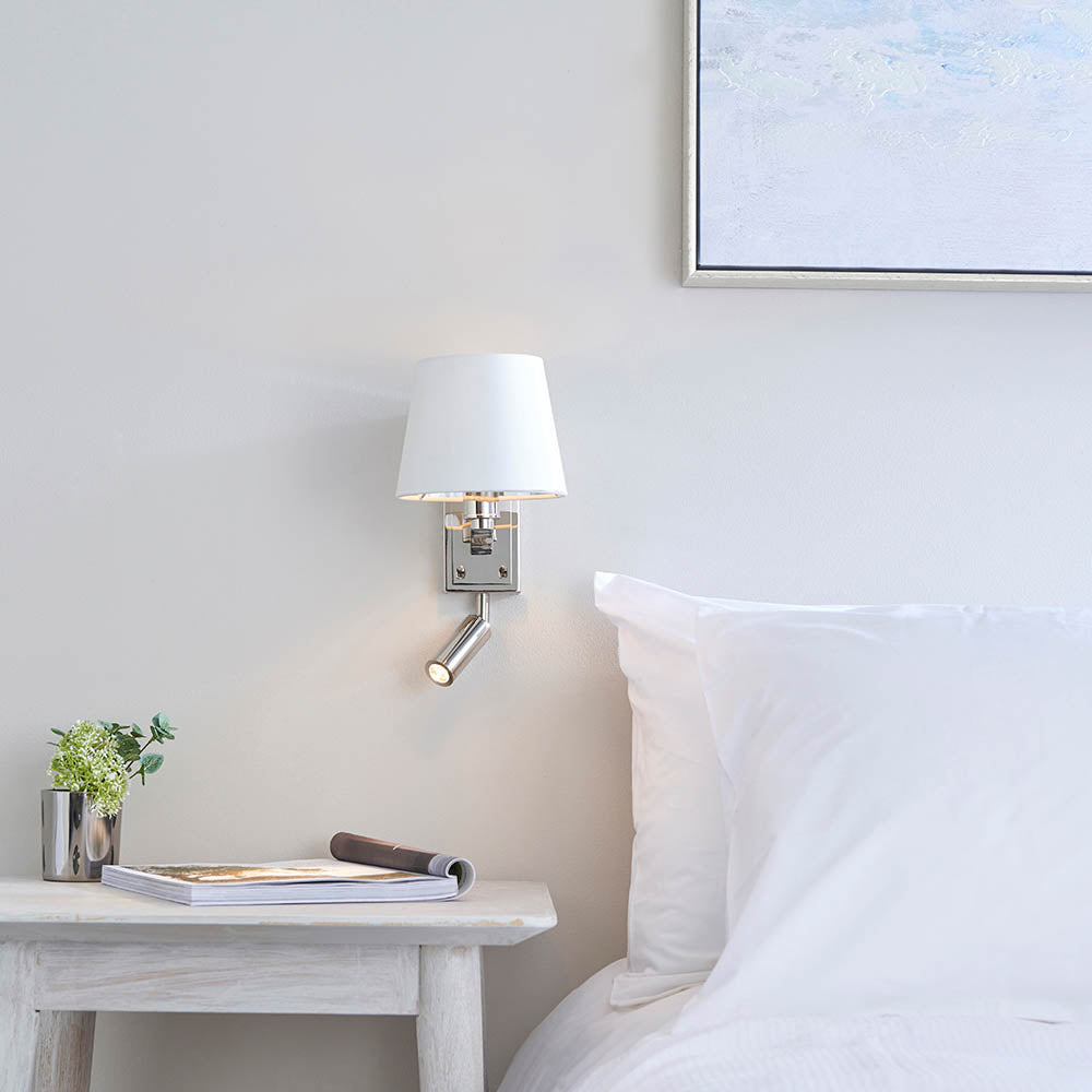 The Harvey wall and reading light is finished in bright nickel plate complemented by a vintage white, faux silk shade, with a silver lined, vintage white, faux silk shade. Featuring an additional, adjustable LED reading light, for the perfect sophisticated boutique hotel look. Matching items also available.