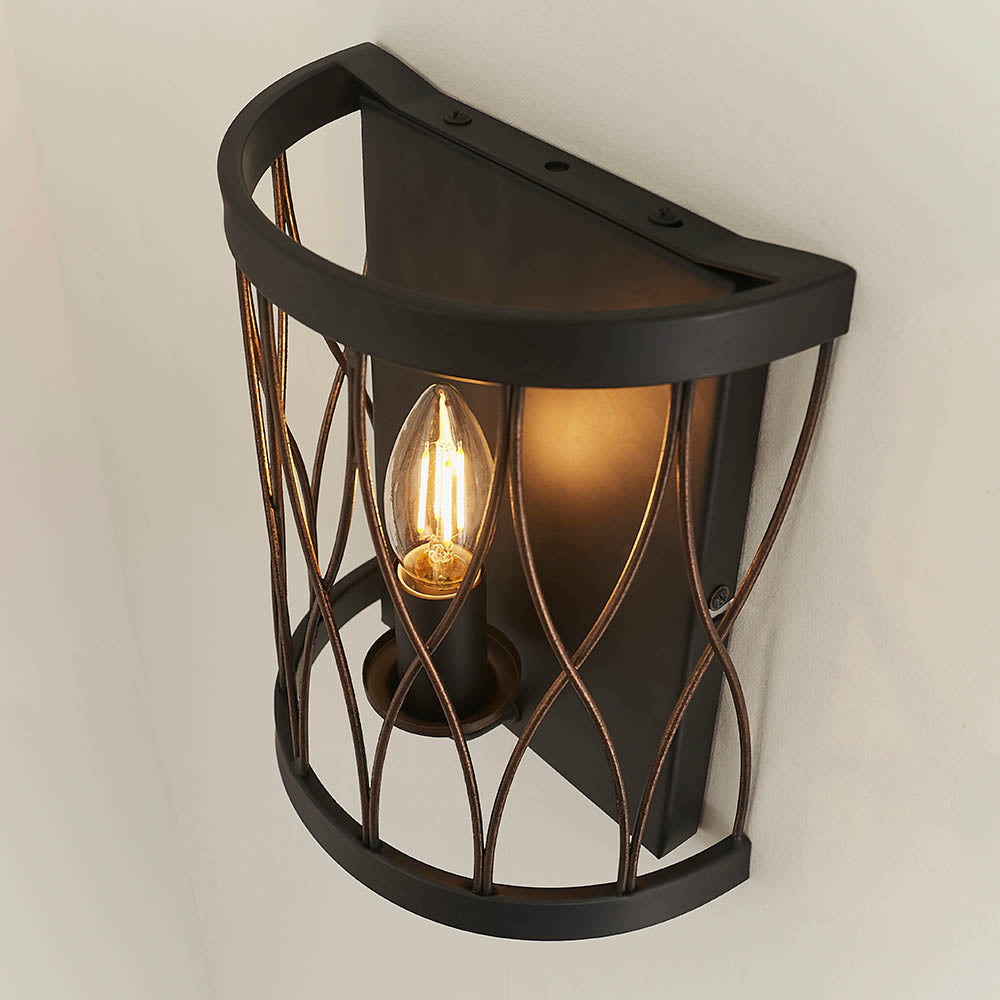 The Heston wall light has a matt black & rustic bronze effect finish, is suitable for use with LED lamps and is dimmable. Choice of ceiling fittings also available