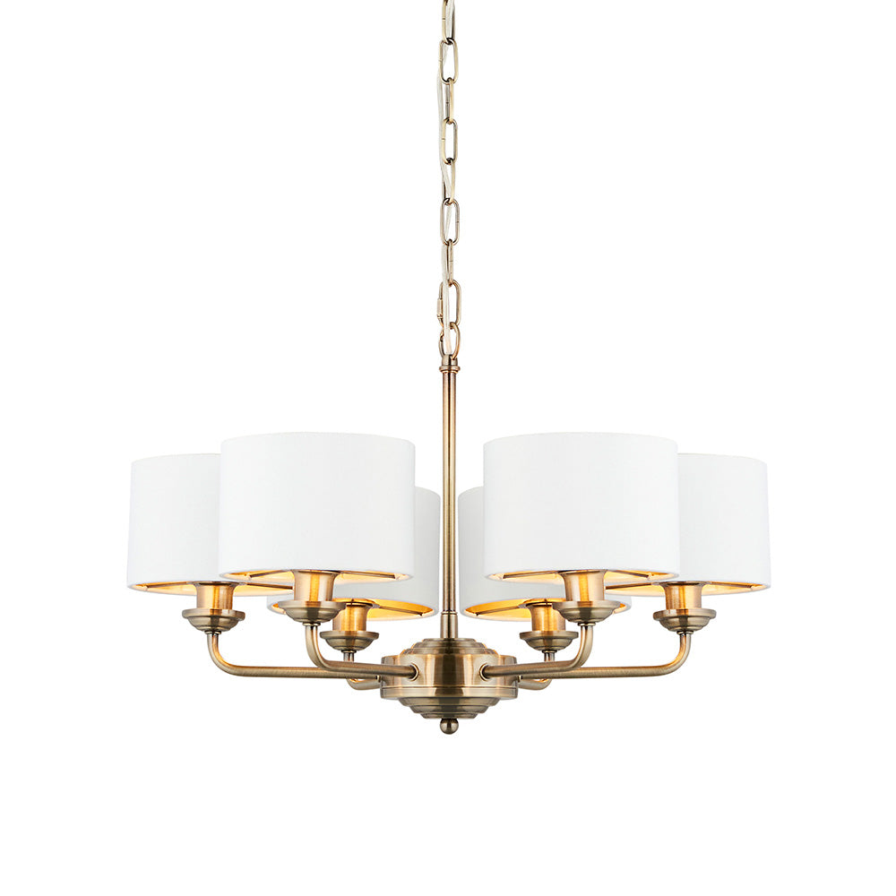 The Highclere multi arm pendant is a sophisticated mix of vintage white fabric shade lined with gold metallic inner and antique brass plated metalwork. This statement light is the perfect timeless addition to modern and classic homes of today.