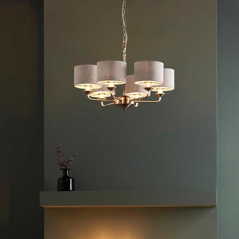 The Highclere multi arm pendant is a sophisticated combination of Natural 100% linen fabric shades with brushed metallic inner and brushed chrome plated metalwork. This statement light is the perfect timeless addition to modern and classic homes of today.
