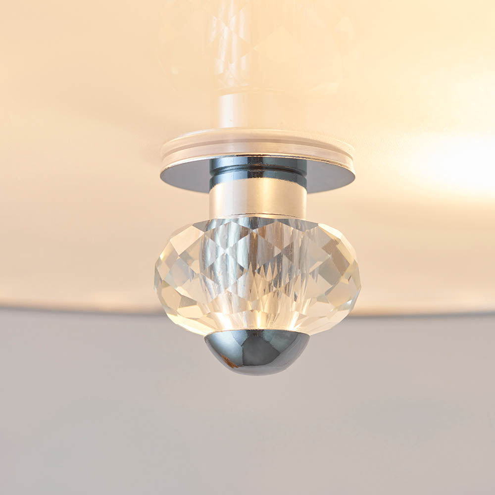 A flush ceiling pendant with a polished chrome finish. The shade is made of crystal beads and an opal diffuser to the bottom. Both dimmable and suitable for use with LED lamps. Matching items available