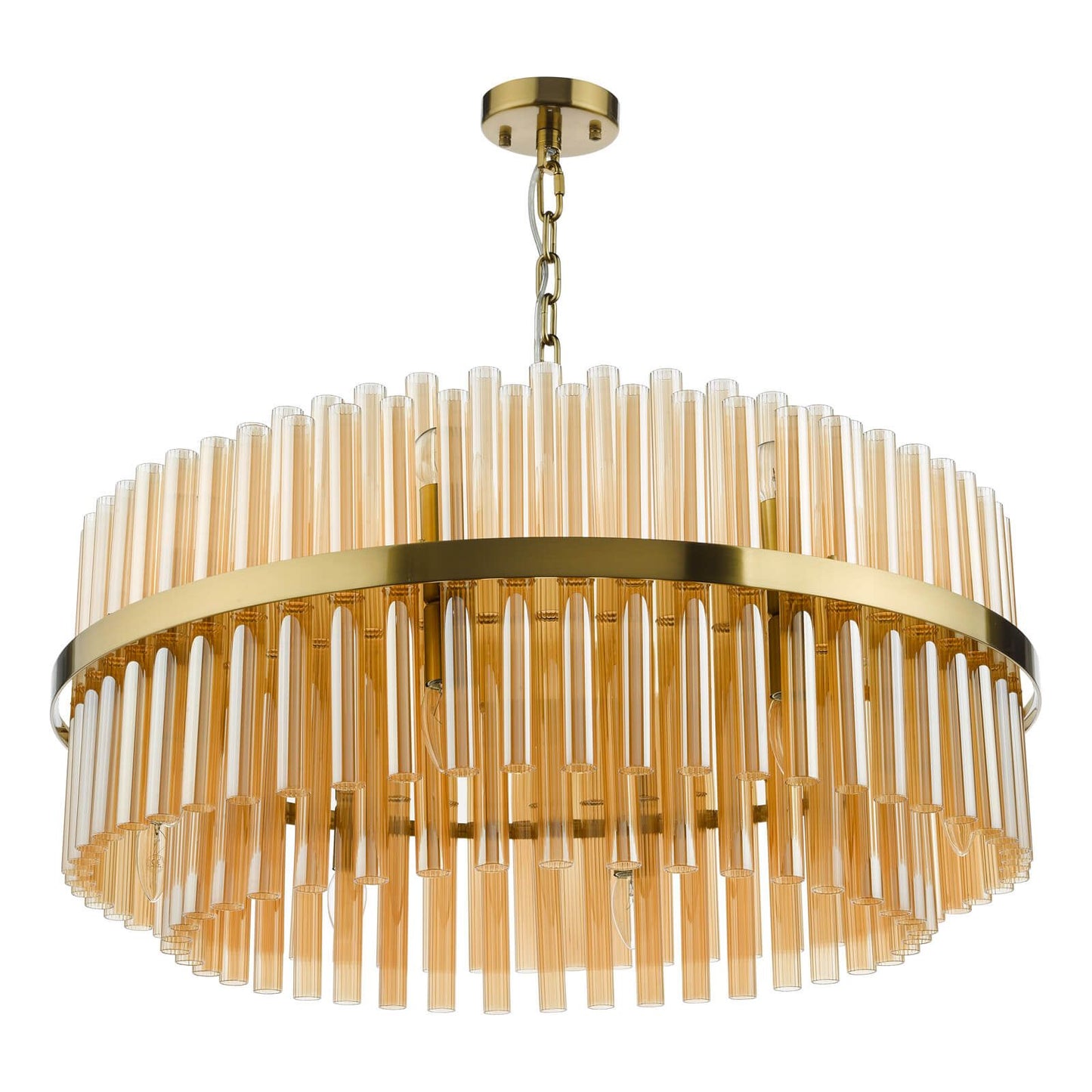 Introducing the Imani 16 Light Pendant Natural Brass and Champagne Glass, a masterpiece of modern design and sophistication that elevates your living space to new heights. This pendant features a captivating arrangement of oversized ribbed glass rods in a rich amber hue, encased within a complementary bronze ring. The polished gold interior adds a touch of opulence, creating the illusion of the glass floating effortlessly above.