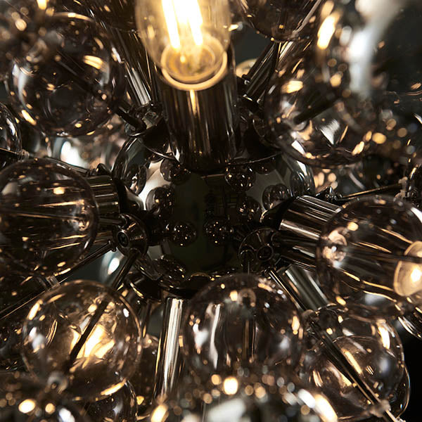 Make a dramatic statement with this spectacular, mirror bomb light fitting embellished with glossy smoked glass and metallic plated balls. This stunning, nine-light pendant features an explosion of shiny glass spheres, creating an atmospheric glow and striking shadow patterns.