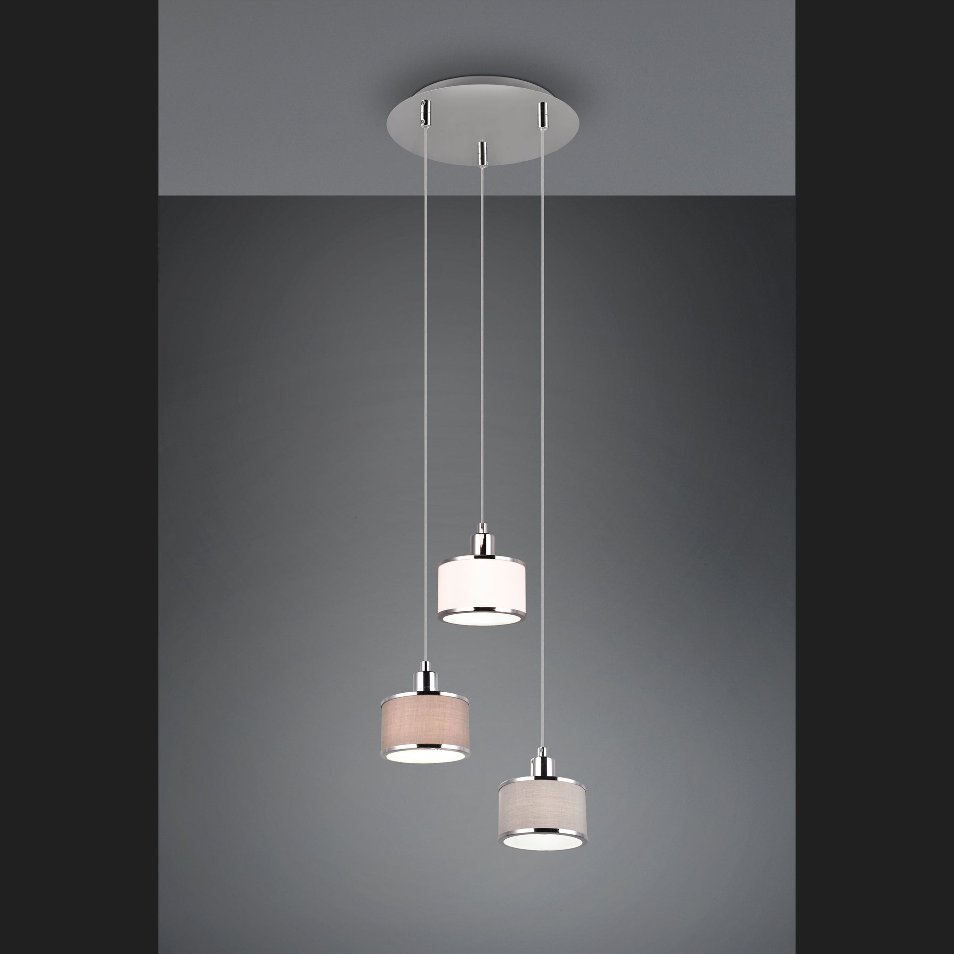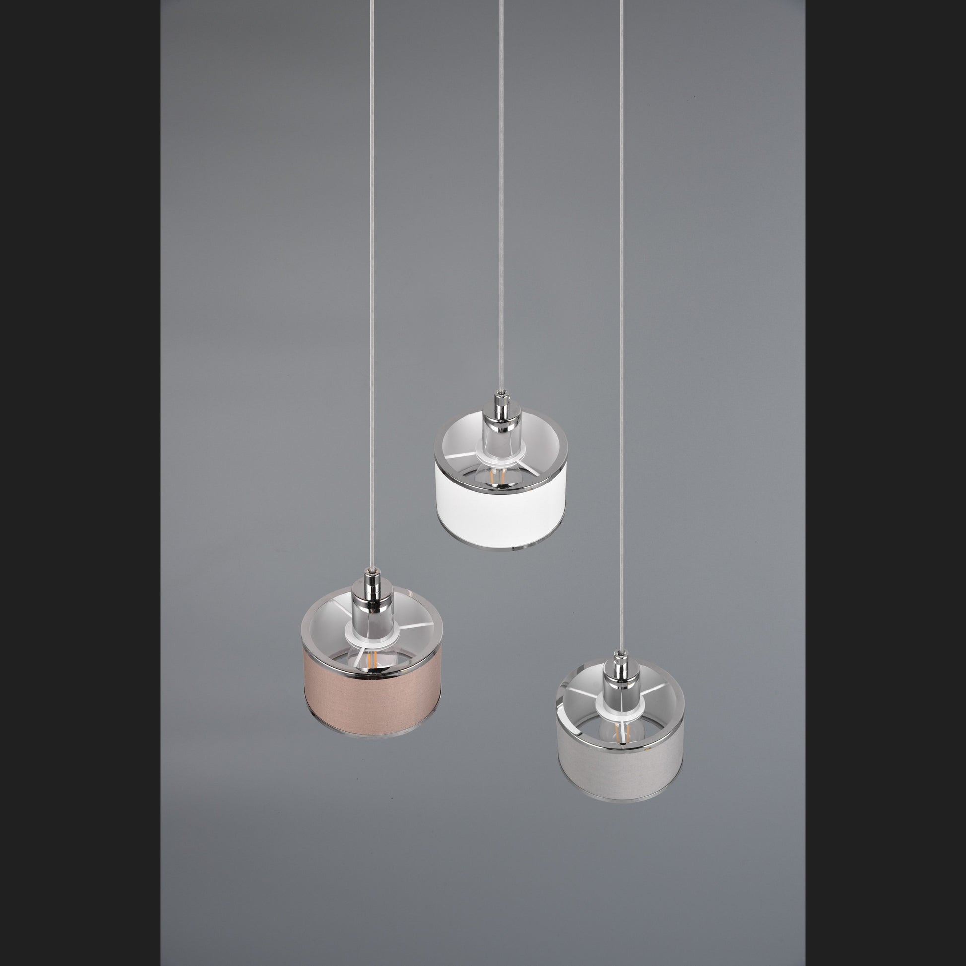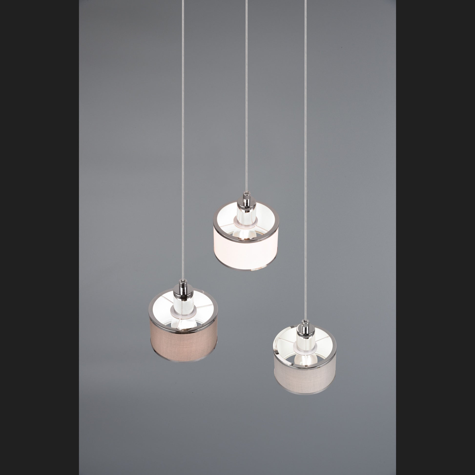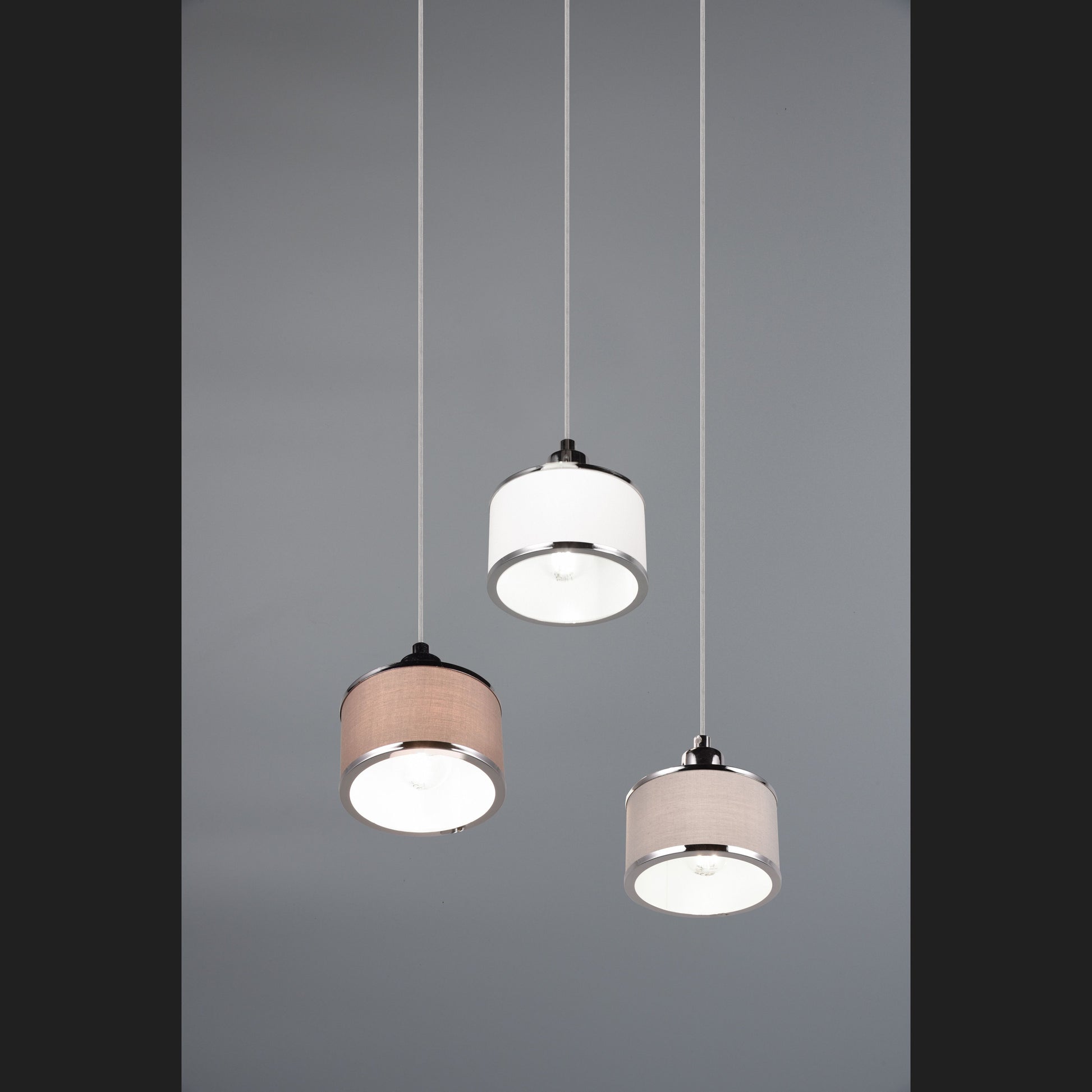 The KAPRUN luminaire series - warm flair combined with light! The successful combination of cylindrical shapes and high-quality textile fabric creates an ambience of elegance and luminous harmony. The three-light pendant luminaire also ensures warm reflections and a cosy, inviting play of light above a dining table or kitchen counter. The chic colour nuances in chrome, grey, brown and white add an individual touch to your home and underline the wow effect. The use of LED light sources is recommended for energy-saving lighting. These are an ideal alternative to conventional halogen light sources and offer high light quality and energy savings of up to 80%. With LED light sources, you also benefit from a long service life and low heat generation while protecting the environment.