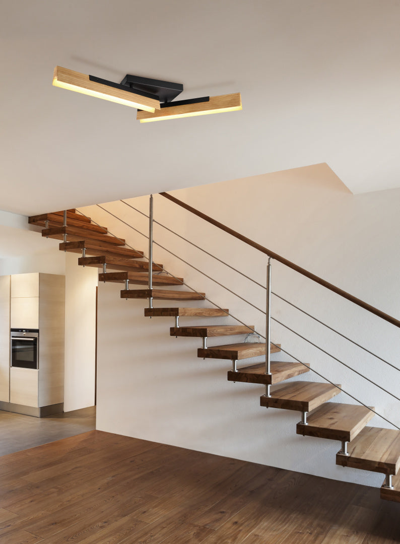 Thanks to its straight lines, the KERALA ceiling light can be integrated into a variety of living spaces with ease. Due to the high-quality workmanship of wood and metal, the luminaire convinces all along the line and sets decorative light accents due to the eye-catching design and the swivelling wooden elements. Three different brightness levels can be selected via the integrated SWITCH dimmer using a conventional light switch. By graduating the light intensity from 100% to 50% and 25%, the luminaire can thus be adapted to different needs. The colour design in matt black in combination with the natural wood creates a cosy ambience in your home. In addition, the luminaire features modern LED technology, which is characterised by high light quality and energy efficiency. Compared to conventional halogen lamps, up to 80% of energy costs can be saved. In addition, LED light sources have a long service life, produce less heat and protect the environment.