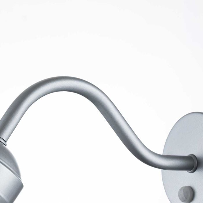 Klampenborg is a classic Scandinavian swan neck wall lantern with PIR sensor. The core metal is 304 grade stainless steel and is then painted with powder coating for durability. Available in silver finish, IP44 rated and offered with a 15 year guarantee.
