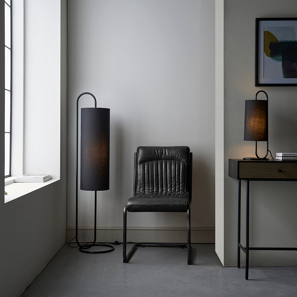 Floating cylinder black fabric shade encapsulated by the soft curves of matt black painted metal work. A table light perfect for today's contemporary living; matching items and other finishes also available.