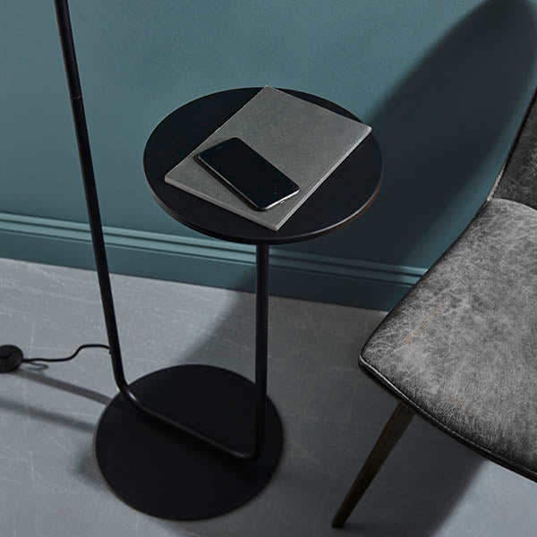 A modern mix of lighting and furniture design perfect for contemporary living. Strong in form with a satin black finish and black fabric shade featuring an integrated table for everyday objects. Matching items available.