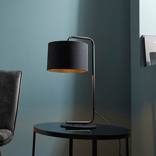 A modern table light in satin black finish with black fabric shade. Perfect for contemporary living; matching items available.