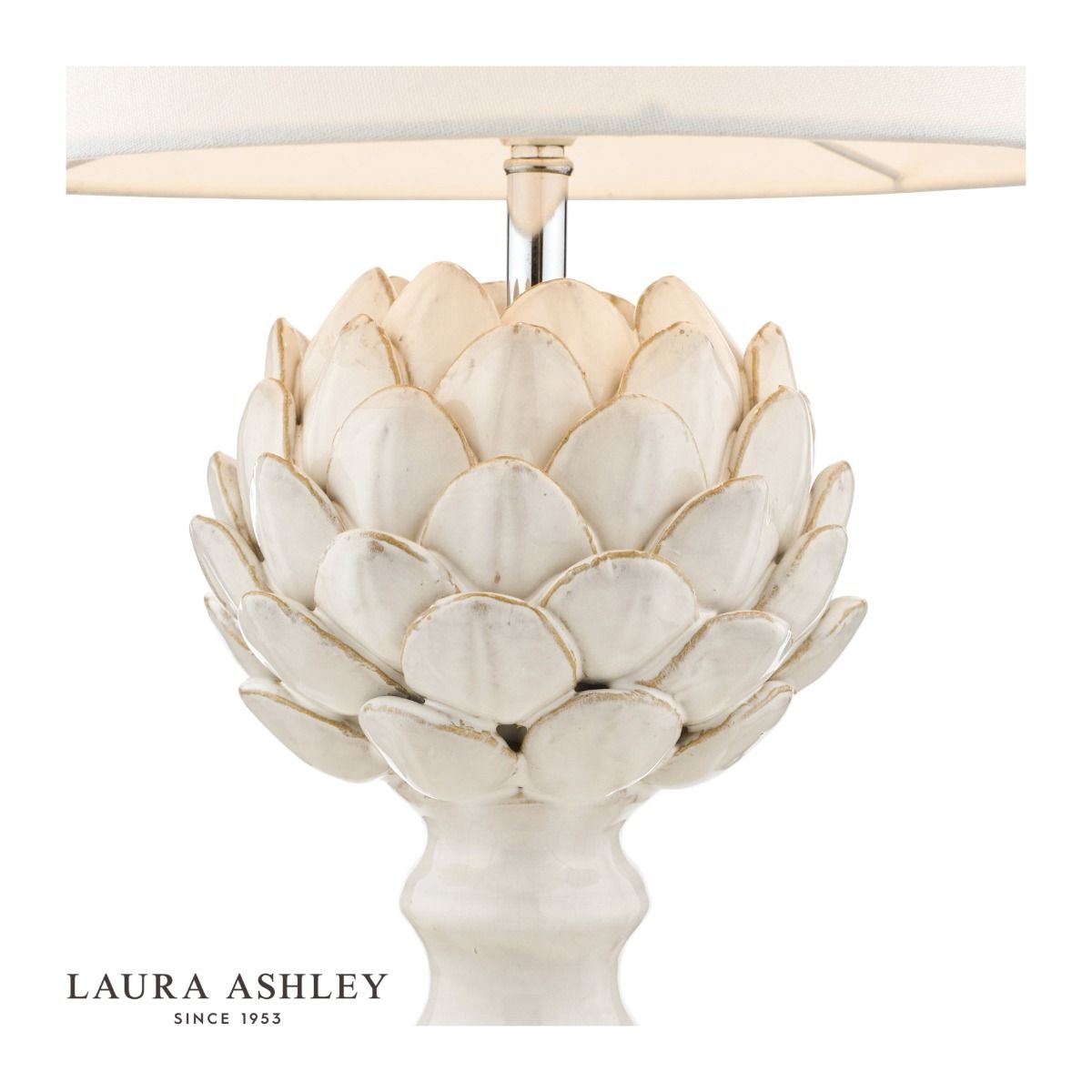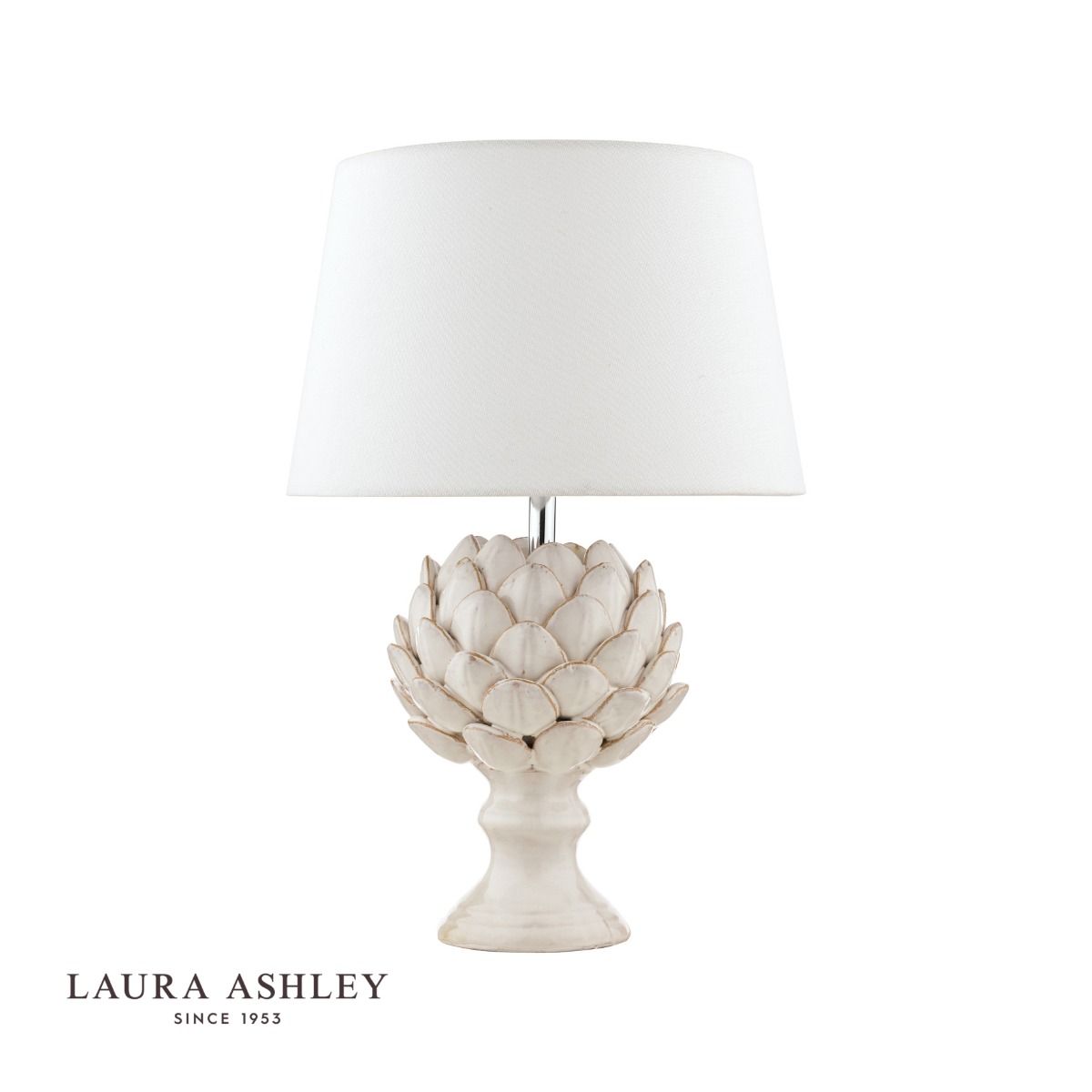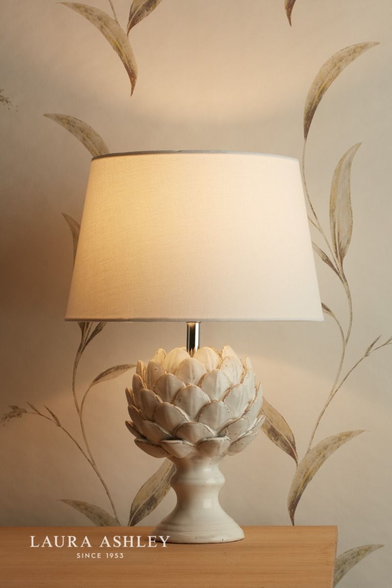 Almost good enough to eat, the naturally curvaceous shape of the artichoke has inspired this gorgeous Artichoke ceramic table lamp from Laura Ashley. Gloss-glazed in a classic ivory, and finished with polished chrome fittings and a tapered drum shade in neutral, ivory-white linen, this stoneware table light is a versatile, statement piece that enhances contemporary and traditional interiors with ease.