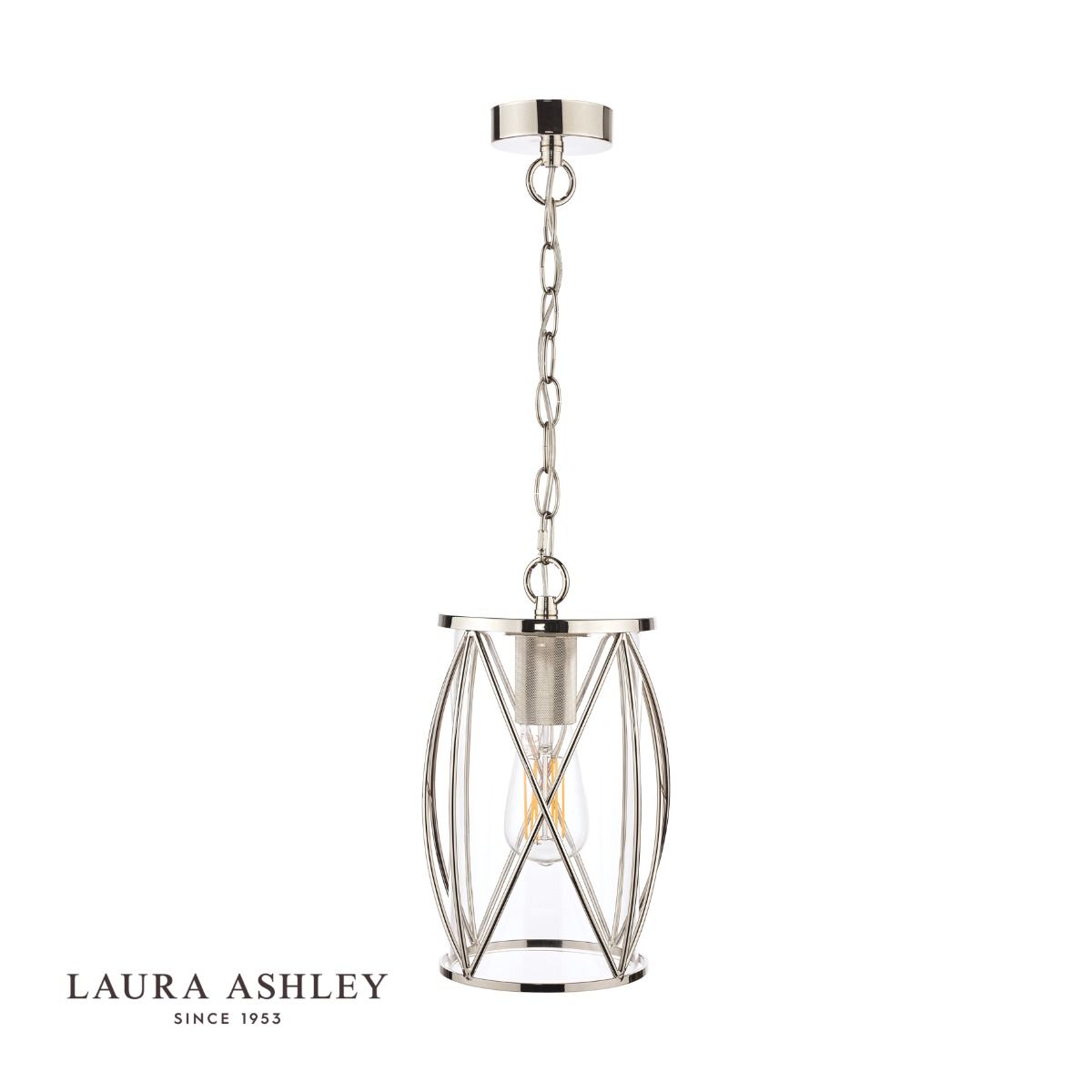 The Laura Ashley Beckworth ceiling light is a large modern pendant in a gorgeous lantern style. A slick, curved lattice in vintage polished nickel encasing a clear glass cylinder gives this hanging ceiling light a contemporary style that enhances any interior theme.
