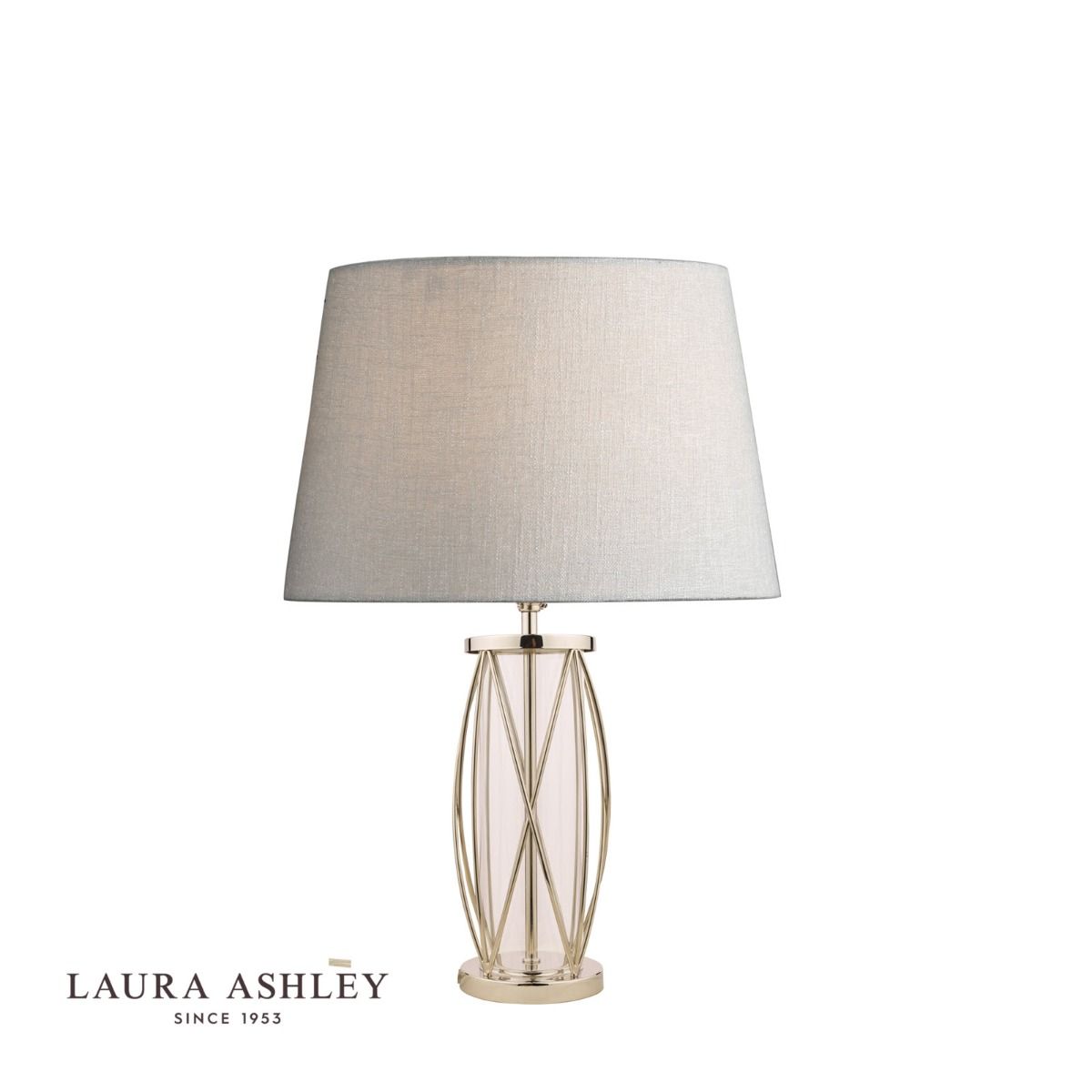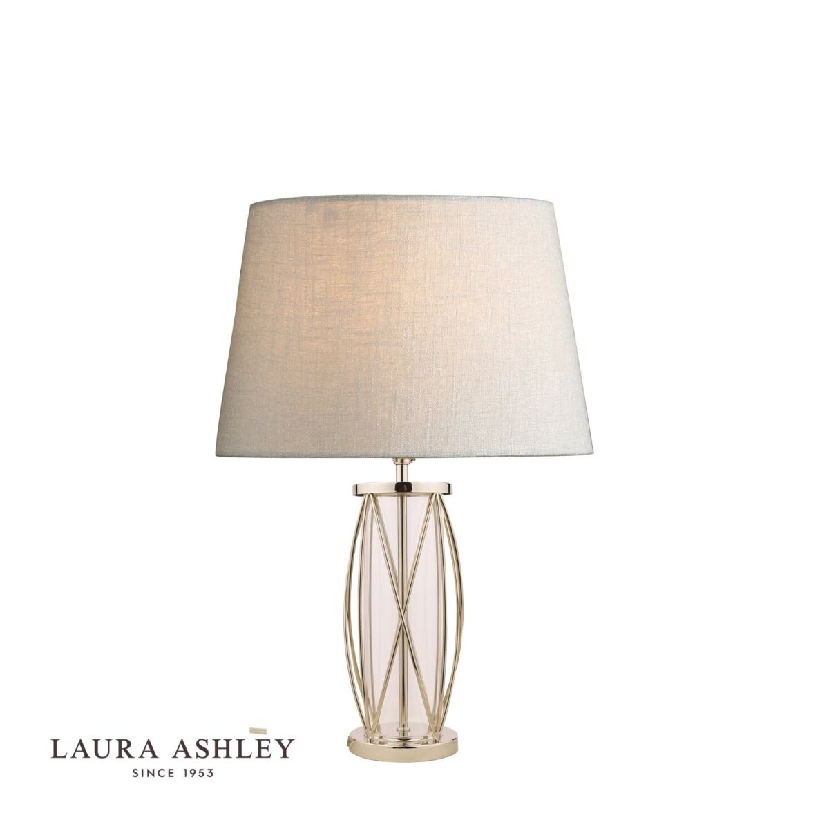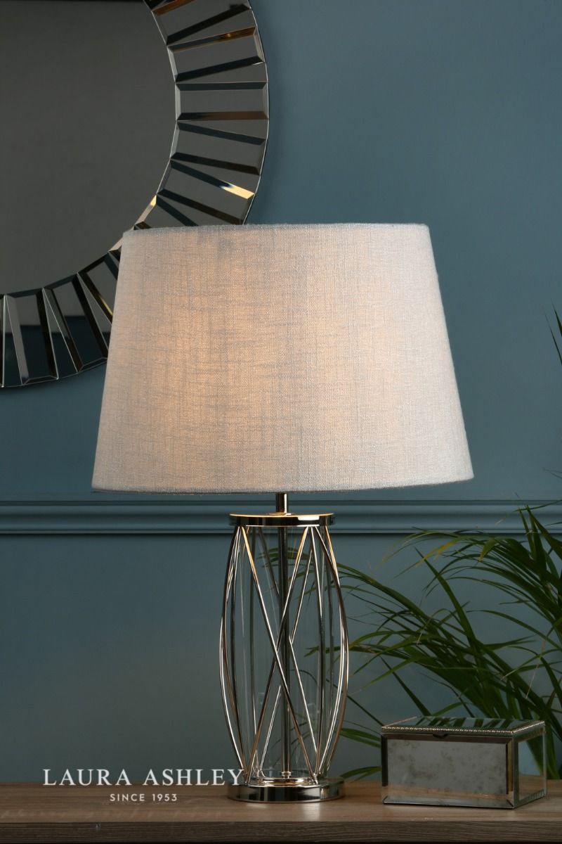 The small Laura Ashley Beckworth table lamp is a modern lamp base in a gorgeous lantern style. A slick, curved lattice in vintage polished nickel encasing a clear glass cylinder gives this table light a contemporary style that enhances any interior theme.