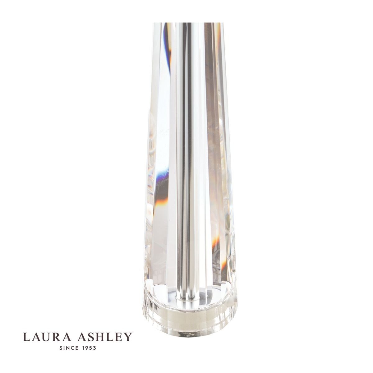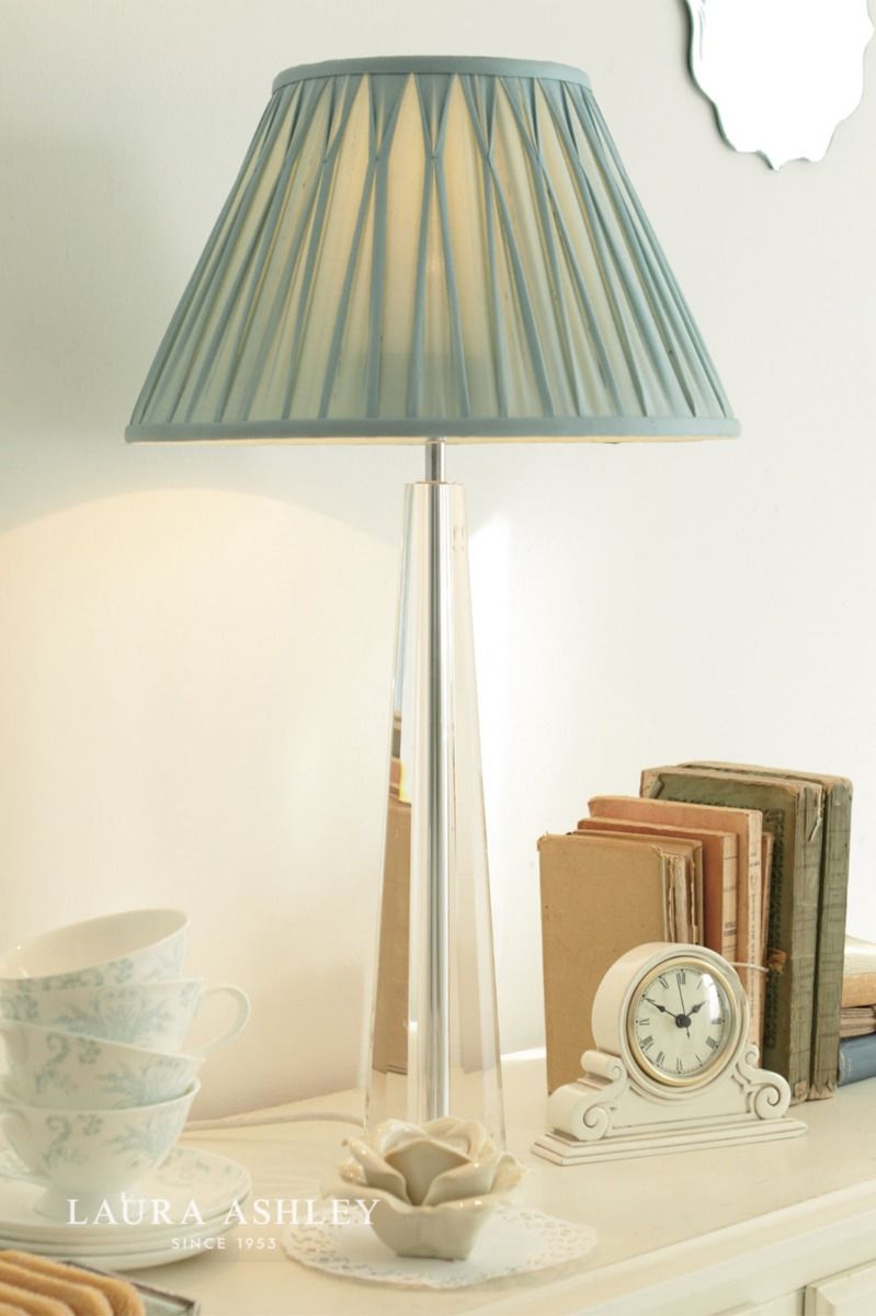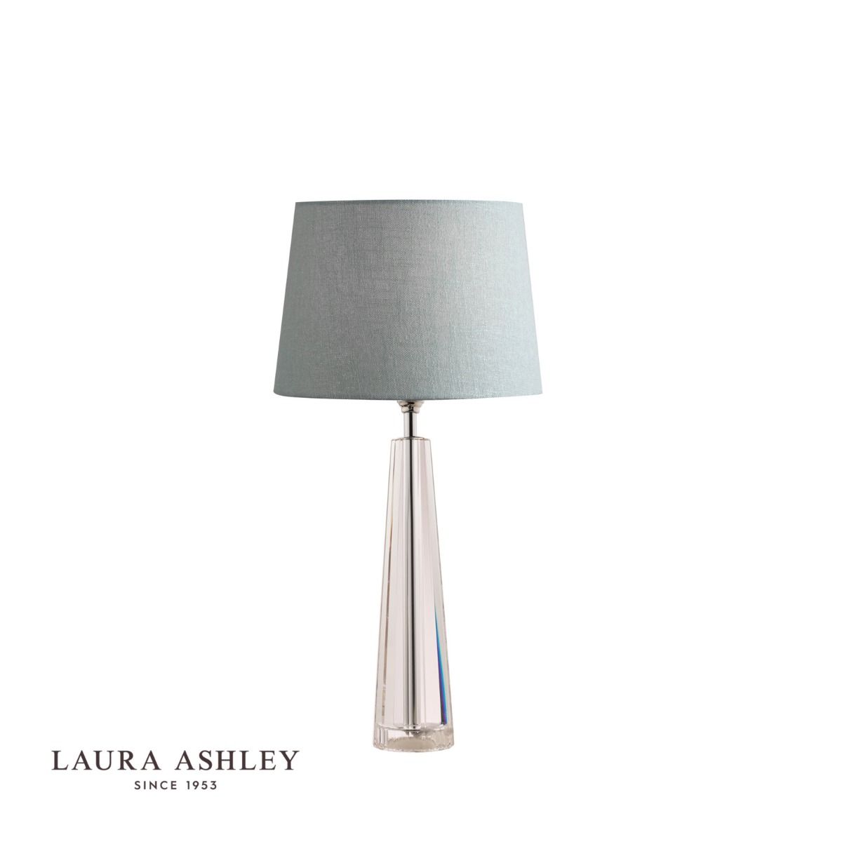 The Laura Ashley Blake table lamp is a beautifully crafted clear cut crystal table light with a thick glass base from which four faceted walls rise to a pinnacle of perfection like an Egyptian obelisk. This heavy lamp base will add contemporary glamour to your home.