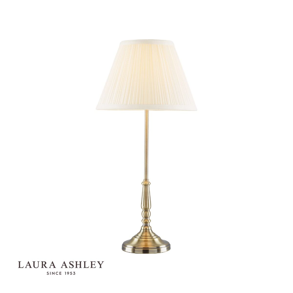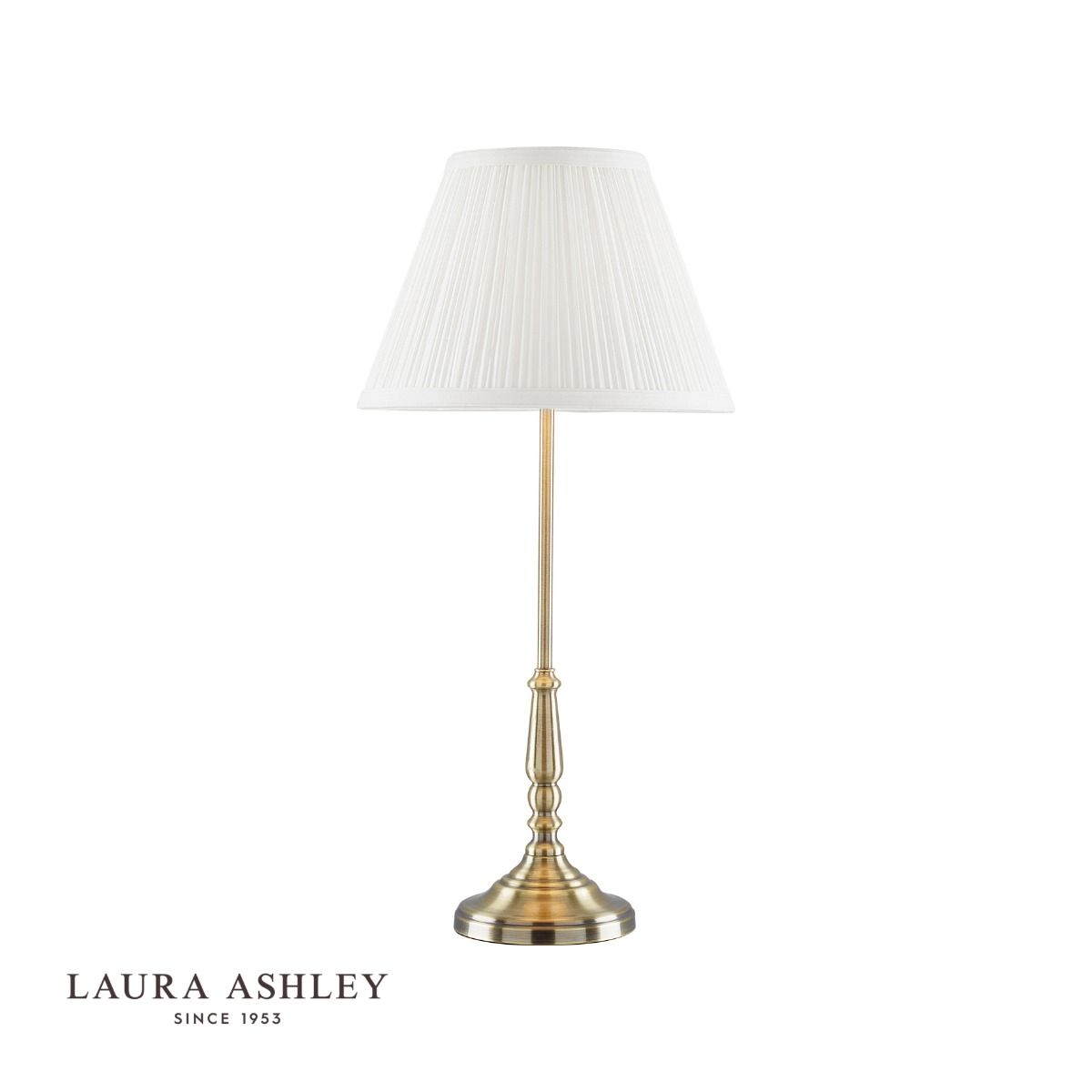 This slim, stylish metal candlestick lamp has a warm antique brass finish. The Laura Ashley Elliot Brass Table Lamp comes complete with a neutrally coloured ivory white pleated shade in smooth cotton.