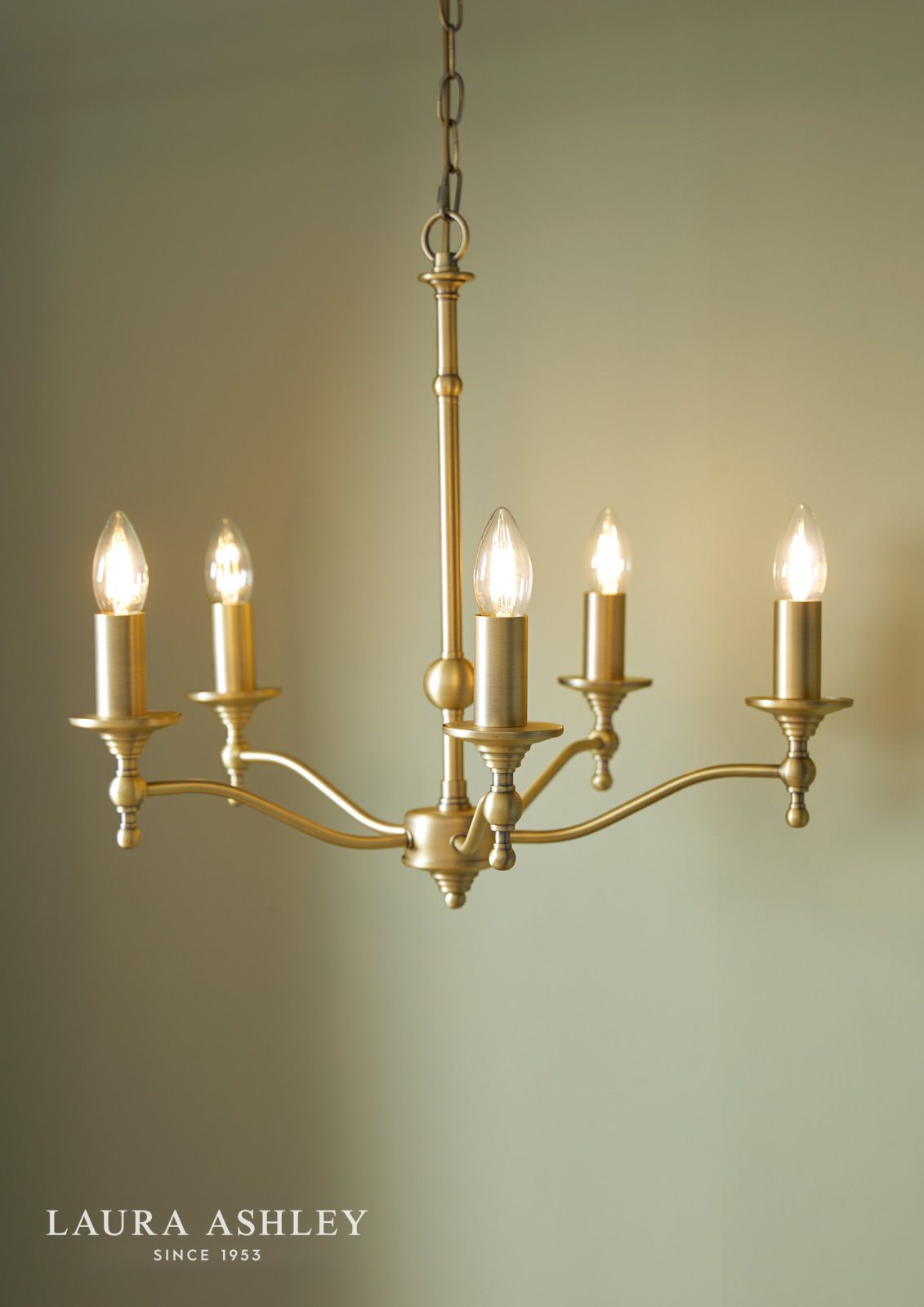 The Ludchurch Five Light Chandelier by Laura Ashley is a timeless classic candelabra style with a luxury Matt Antique Brass finish. We recommend the use of LED bulbs as they are more energy efficient, typically last at least 15000 hours and use 90% less energy than a traditional halogen bulb. Less energy means lower electricity costs.