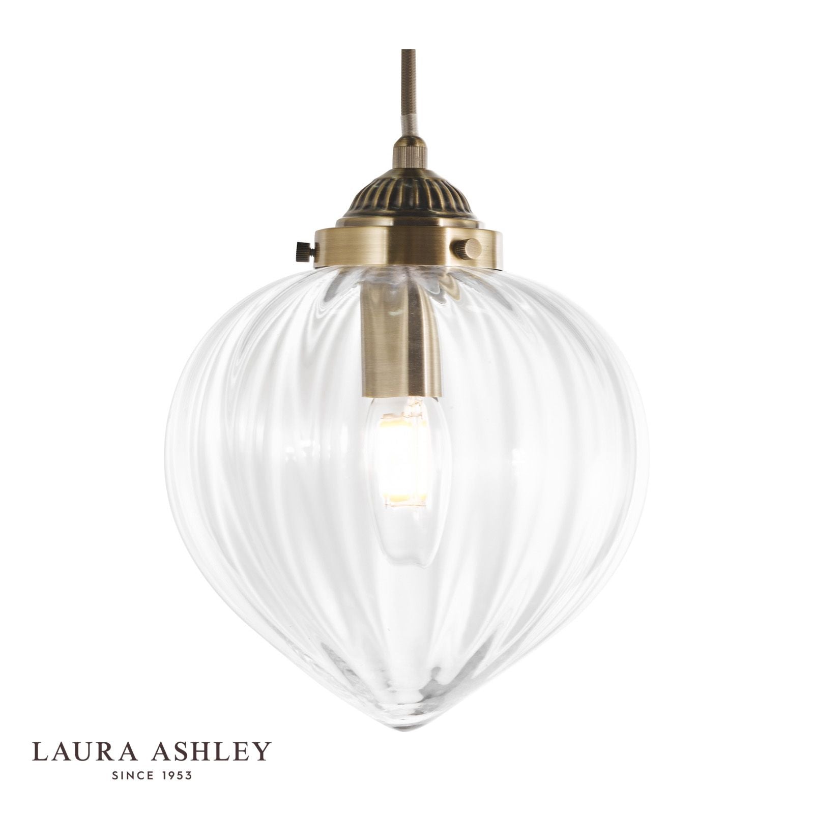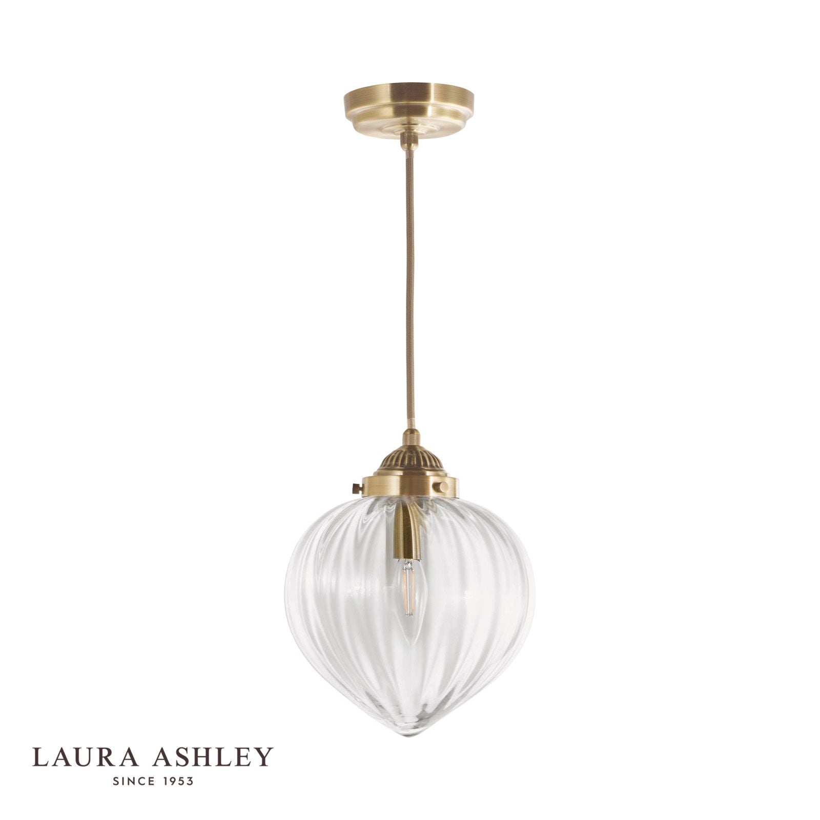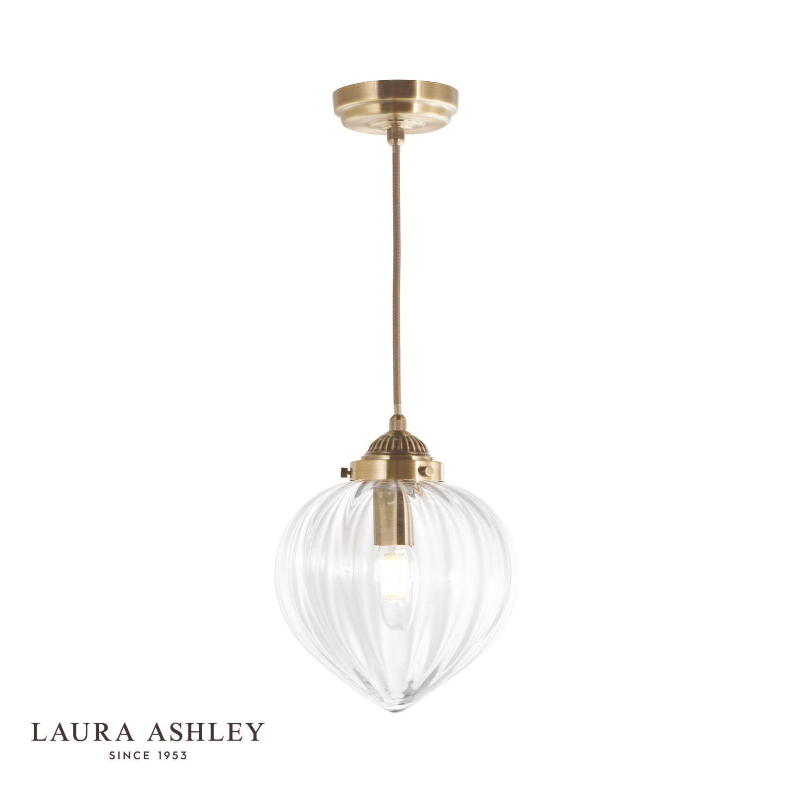 The Laura Ashley Whitham Pendant Light features a fluted solid glass shade, with a feature gold twisted fabric cable. Perfect for a retro style of decor in a stairway or the dining room. We recommend the use of LED bulbs as they are more energy efficient, typically last at least 15000 hours and use 90% less energy than a traditional halogen bulb. Less energy means lower electricity costs.