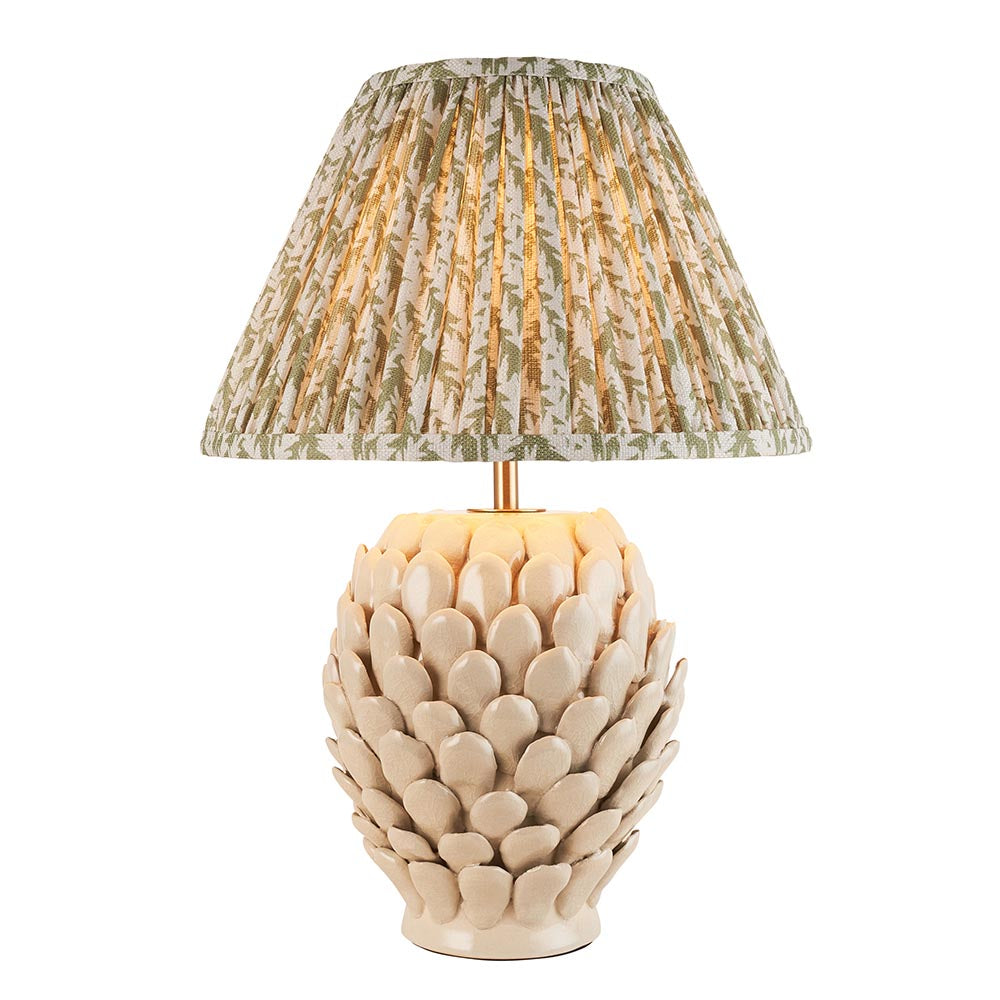 A beautifully organic shaped ceramic table light, decorated with handmade leaf shaped details and brushed aged brass switched B22 lamp holder. Paired with our subtle herb green 30cm Leaf shade to complete the look.