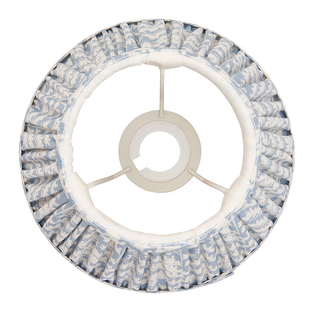 20cm tapered shade with white gimbal. Unique leaf pattern design in a subtle shell bay blue colour with taped edge detailing and plain inner lining.Perfect when paired with one of our beautifully decorative table lights, wall lights or chandeliers.