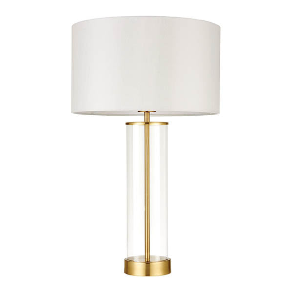 Beautifully simple table light with a clear glass base, vintage white faux silk shade and a brushed gold effect finish. Dimmable via a clever 3 stage touch dimmer