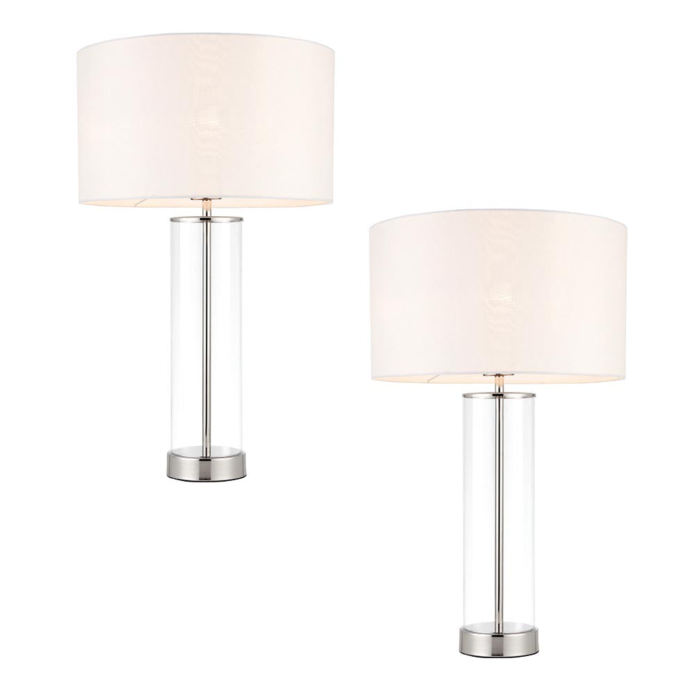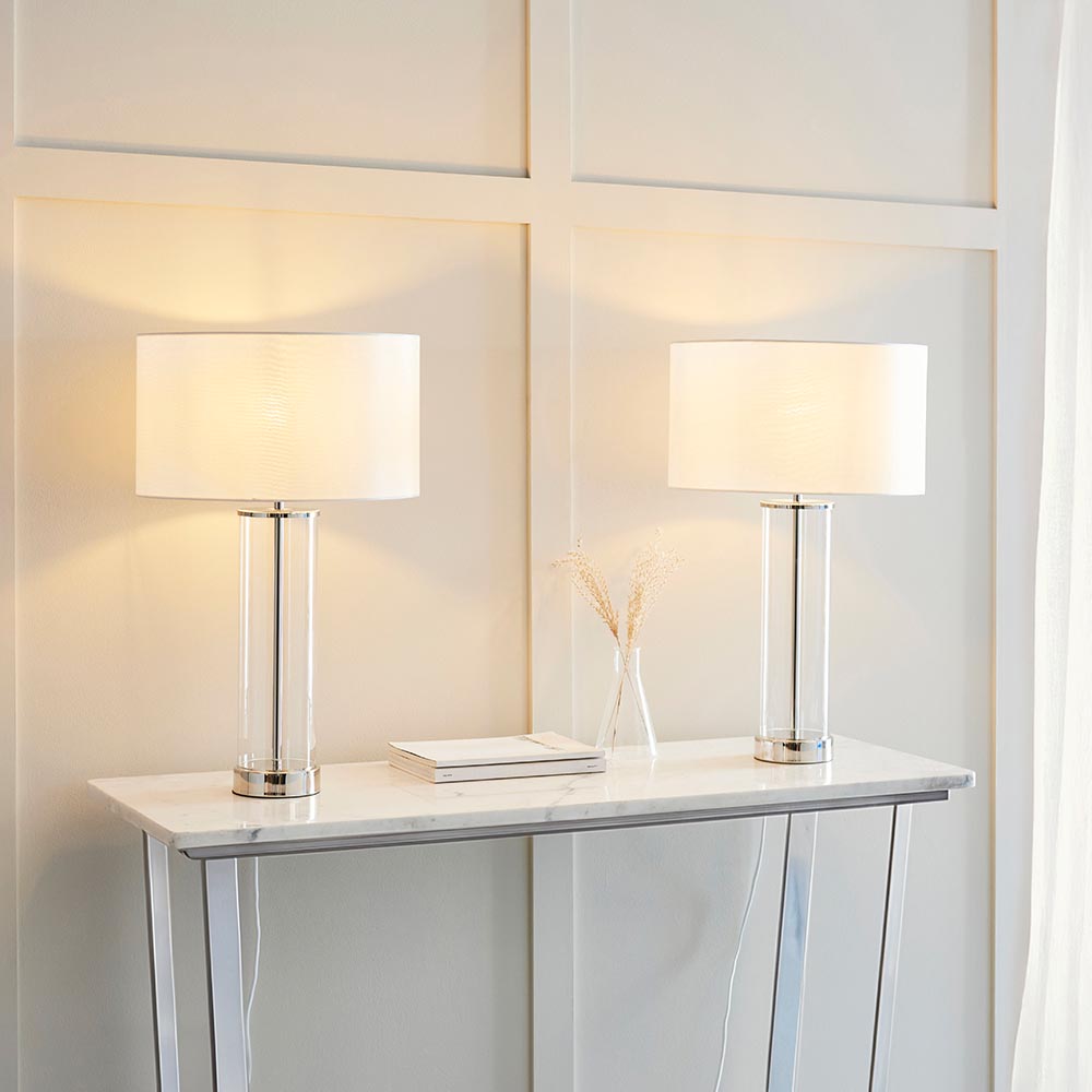 Beautifully simple table light with a clear glass base, vintage white faux silk shade and a bright nickel effect finish. Dimmable via a clever 3 stage touch dimmer