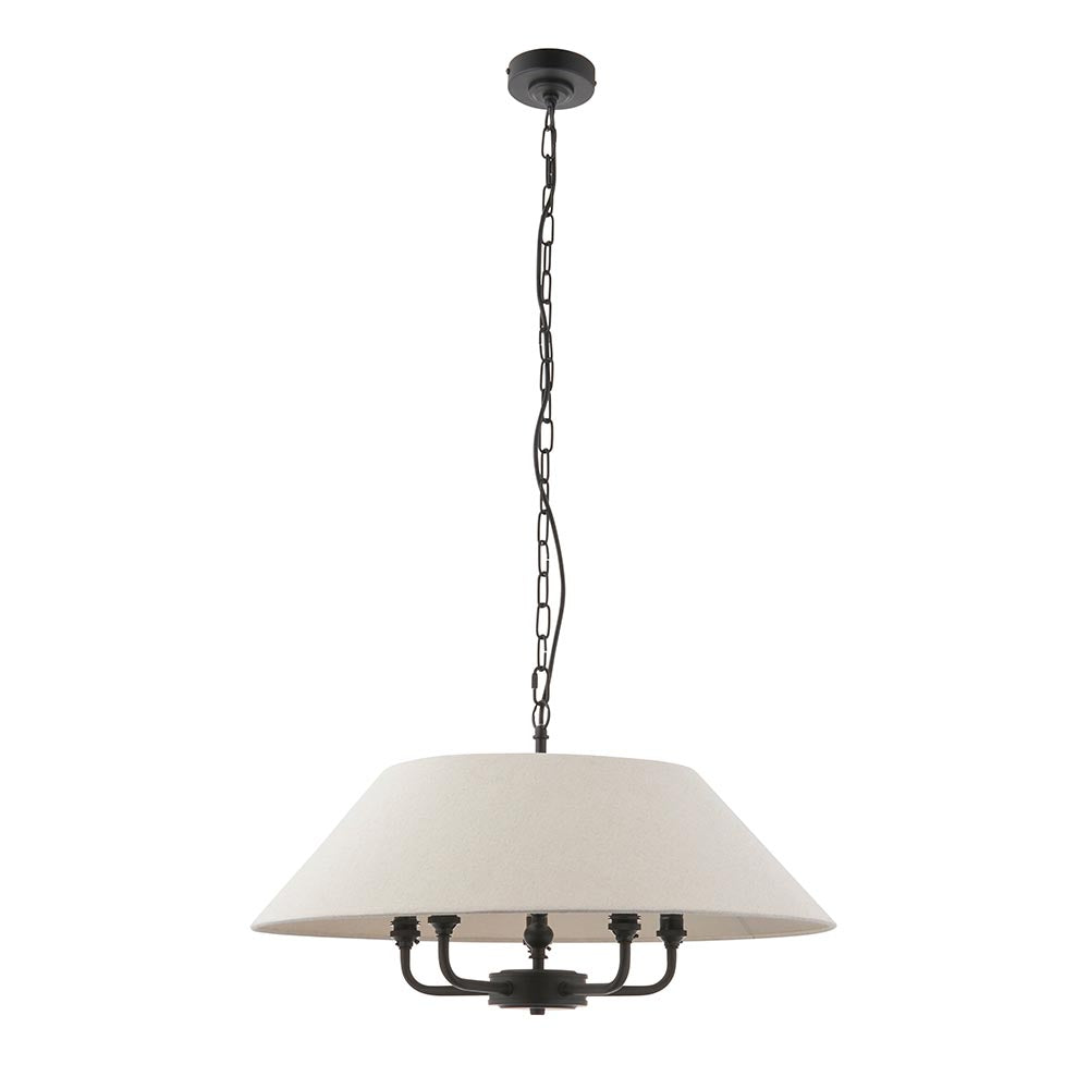 This elegant 5 light pendant is finished in matt black and features a timeless tapered shade in natural linen fabric. Complete with B22 lamp holders for an authentic classic look. Matching items available.