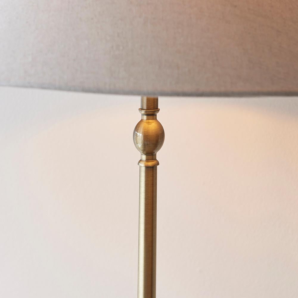 This elegant floor lamp is finished in antique brass plate and features a timeless tapered shade in natural linen fabric. Complete with easy to reach switched B22 lamp holder for an authentic classic look, making it a floor lamp to be proud of. Matching items available.