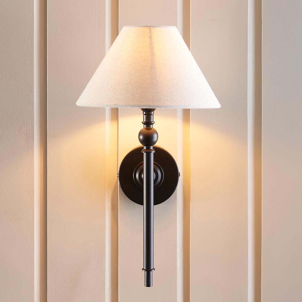 This elegant wall light is finished in matt black and features a timeless tapered shade in natural linen mix fabric. Complete with a B22 lamp holder for an authentic classic look, making it a wall light to be proud of. Matching items available.