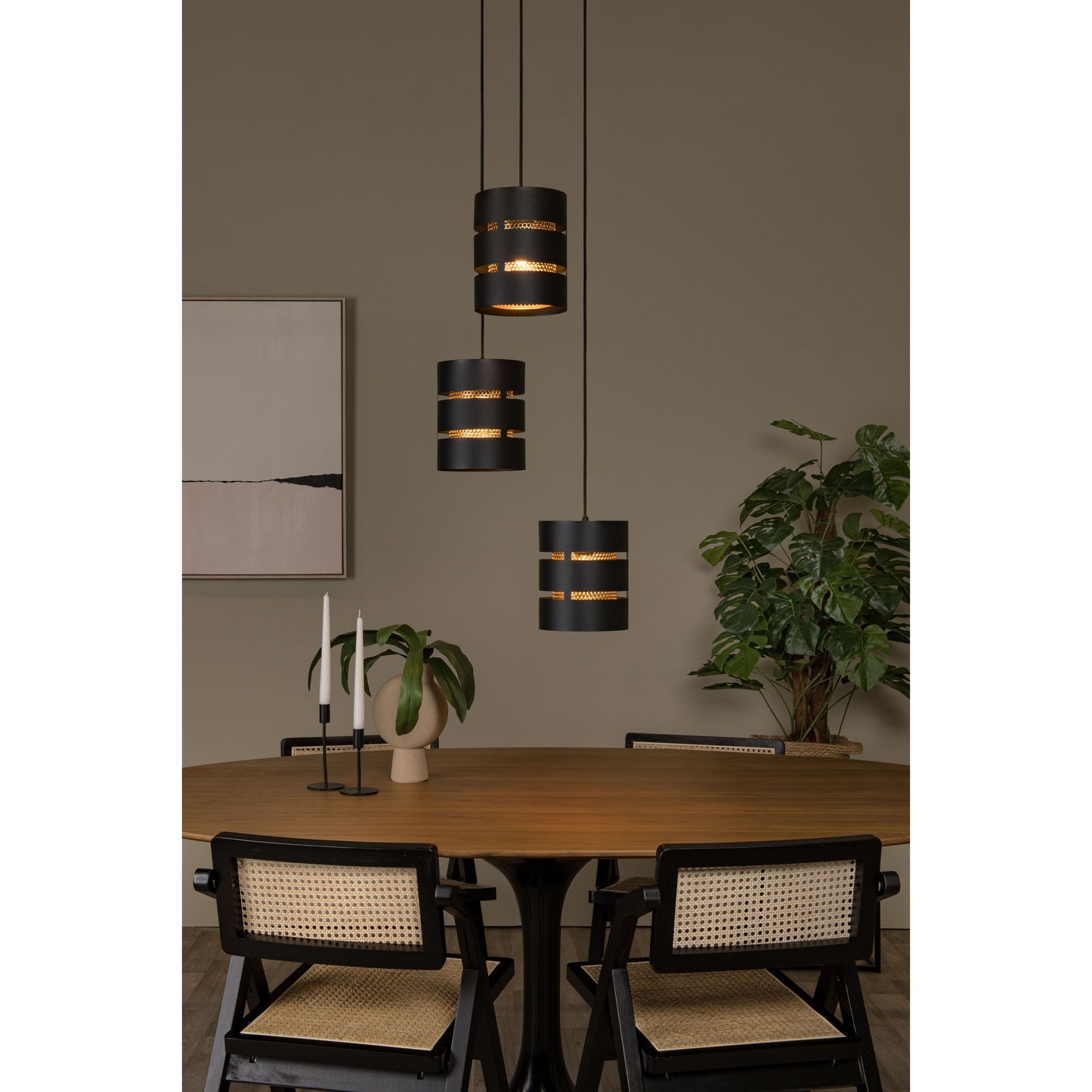 Add a touch of retro charm and a dash of playfulness with Rosas. This elegant pendant with three shades seamlessly blends a dynamic look with warmth. Crafted from high-quality steel, the shades are a modest 18 centimetres in diameter and create the impression of a miniature beehive. Rosas is easy to adjust in height and comes with an external dimmer, allowing you to adjust both the look and the brightness to suit your taste. Whether you want to illuminate your dining area, favourite reading spot or living room, Rosas is always a delightful addition. With Rosas, every room shines a little brighter.