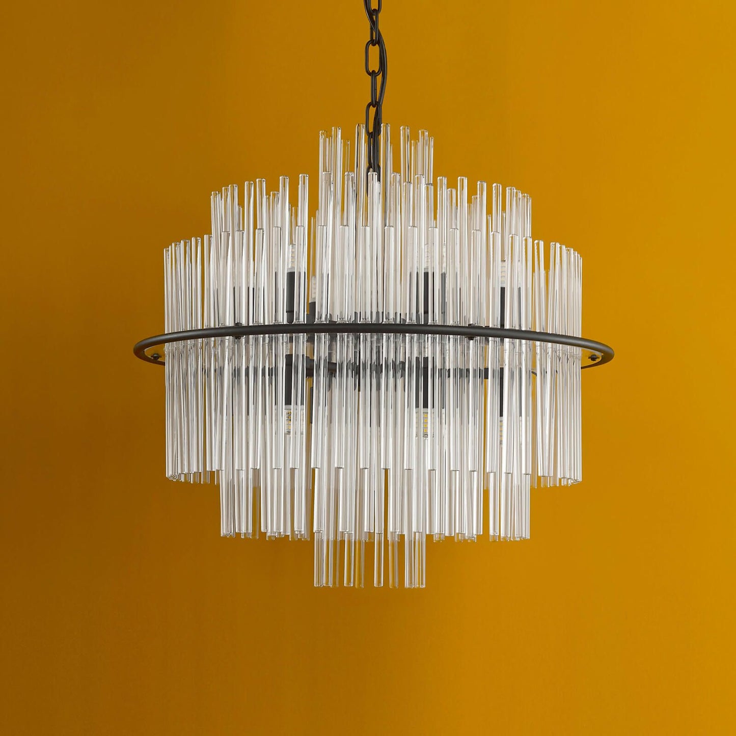 The Lukas 13 Light Pendant, a dazzling masterpiece crafted with hundreds of tiered glass rods, creating a captivating floating illusion within a satin black band. The height-adjustable design allows for customization, making it the ideal statement piece for any living area.