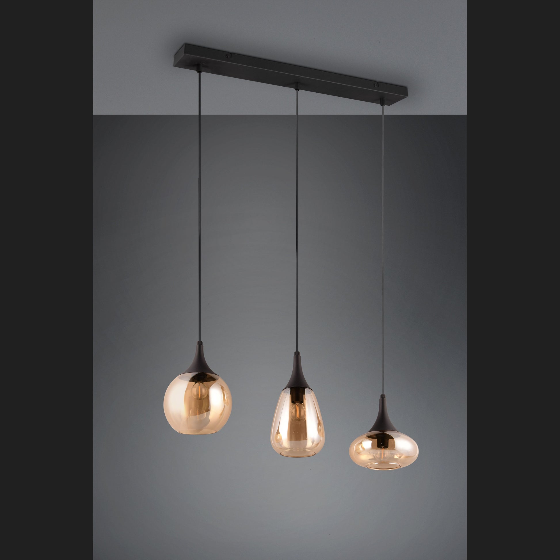The LUMINA pendant light is a special eye-catcher in your living area thanks to its elegant glass shades! The different shapes of the three shades and the composition of metal and glass create a beautiful and unique lighting atmosphere that gives your dining area a modern touch. Thanks to the matt black colour scheme and the amber glass shades, there is plenty of scope for other colours, making it wonderfully easy to integrate into existing living concepts. The use of LED light sources is recommended for energy-saving lighting. These are an ideal alternative to conventional halogen light sources and offer high light quality and energy savings of up to 80%. With LED light sources, you also benefit from a long service life and low heat generation while protecting the environment.