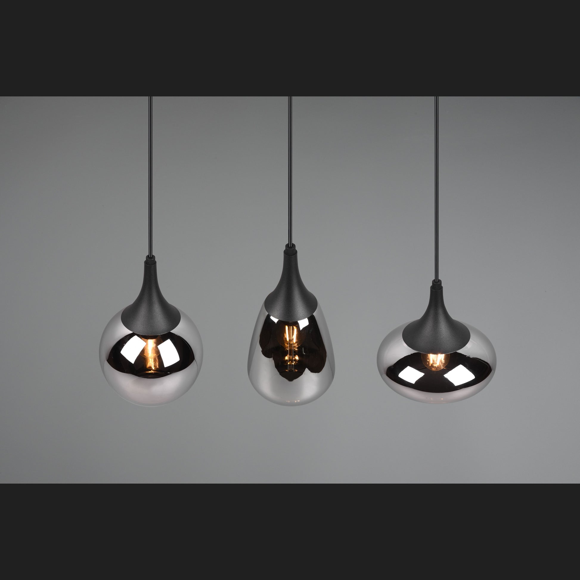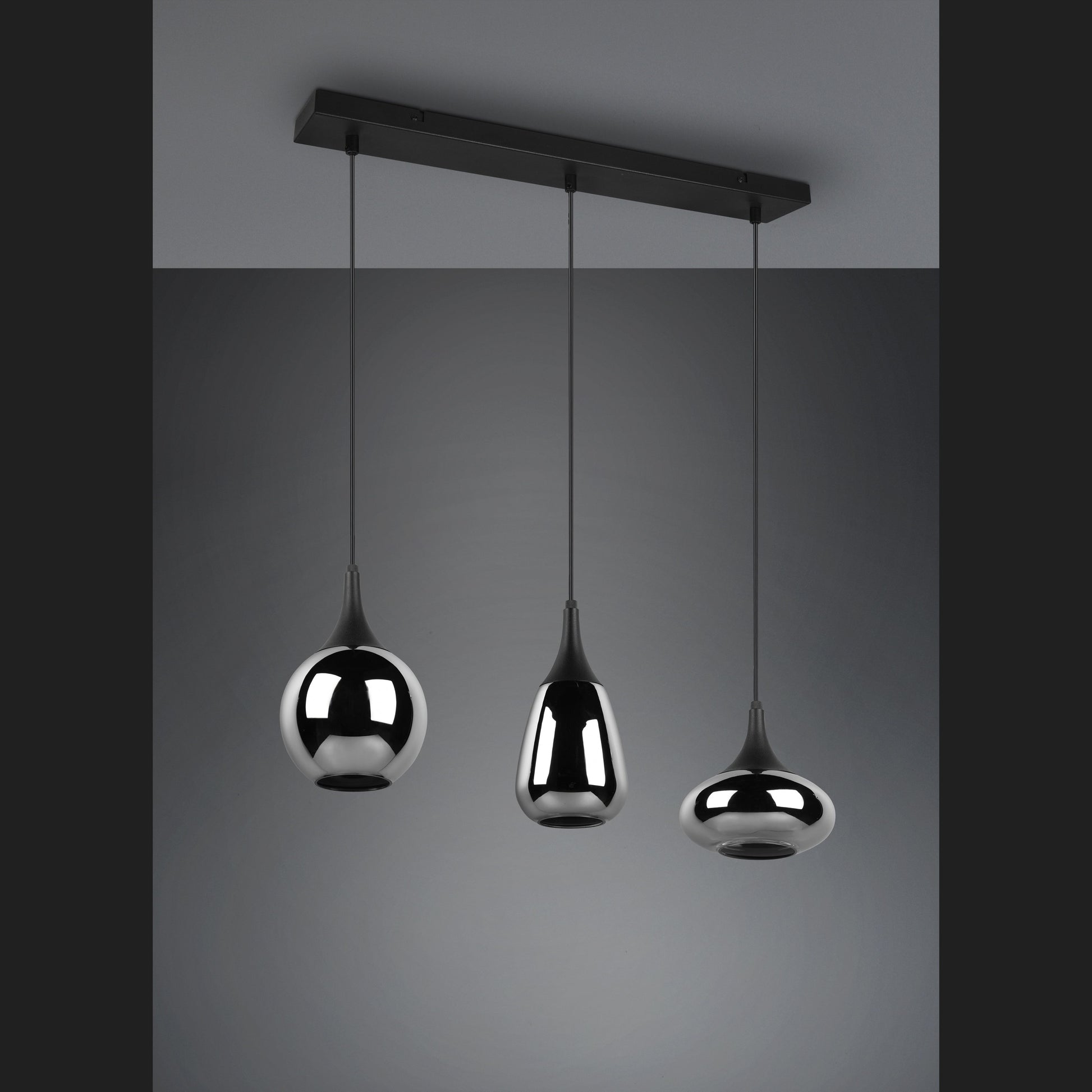 The LUMINA pendant luminaire is a special eye-catcher in your living area thanks to the noble glass shades! The different shapes of the three shades and the composition of metal and glass create a beautiful and unique light atmosphere and breathe a modern touch into your dining area. Thanks to the colour design in matt black and the glass shades in steamed chrome, there is plenty of scope for other colour shades, making it wonderfully easy to integrate into existing living concepts. For energy-saving lighting, it is recommended to use an LED illuminant. These are an optimal alternative to conventional halogen lamps and stand for a high quality of light and energy savings of up to 80%. In addition, LED lamps help you benefit from a long service life, low heat generation and at the same time protect the environment.