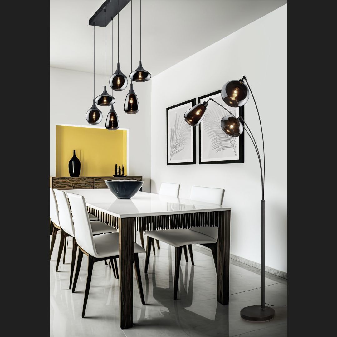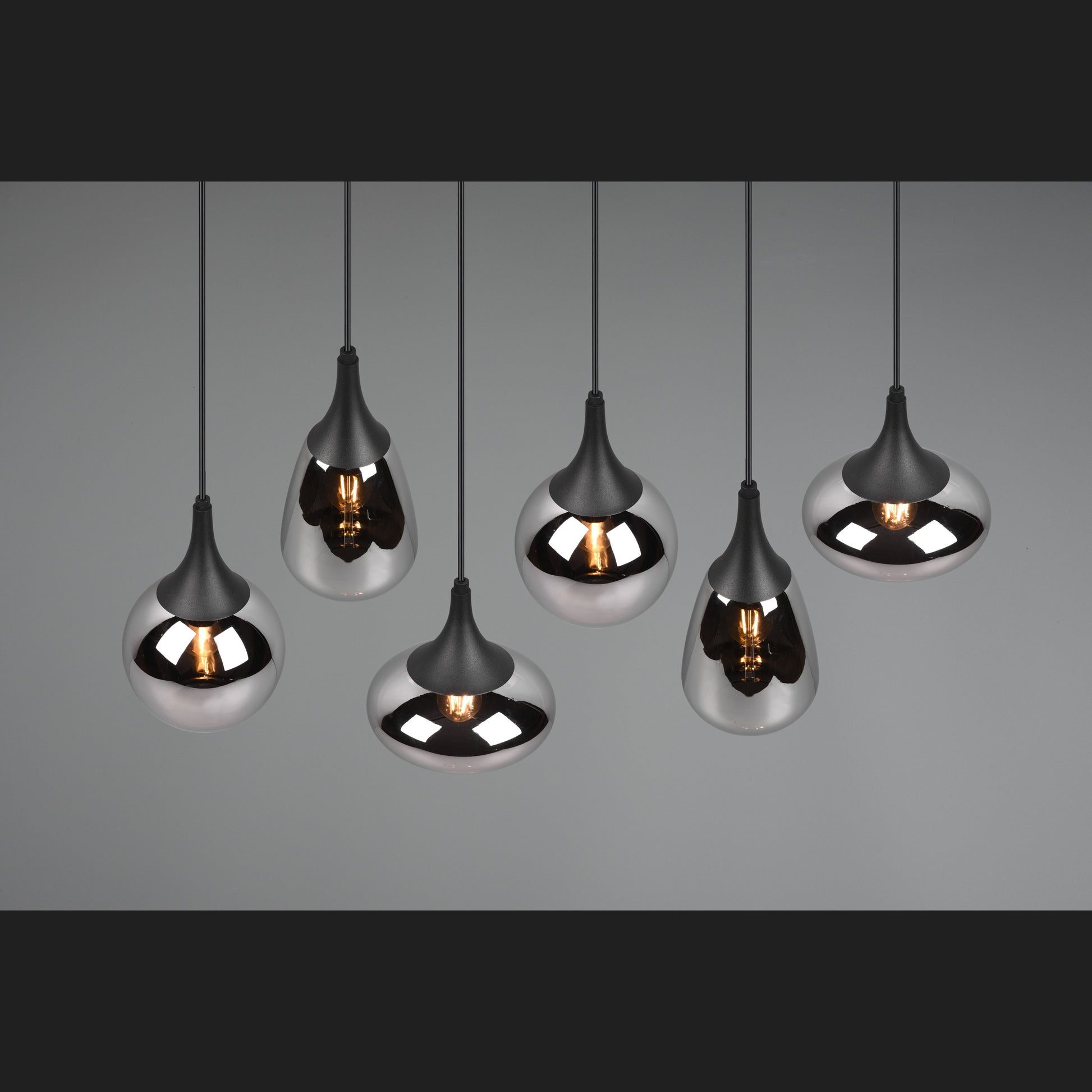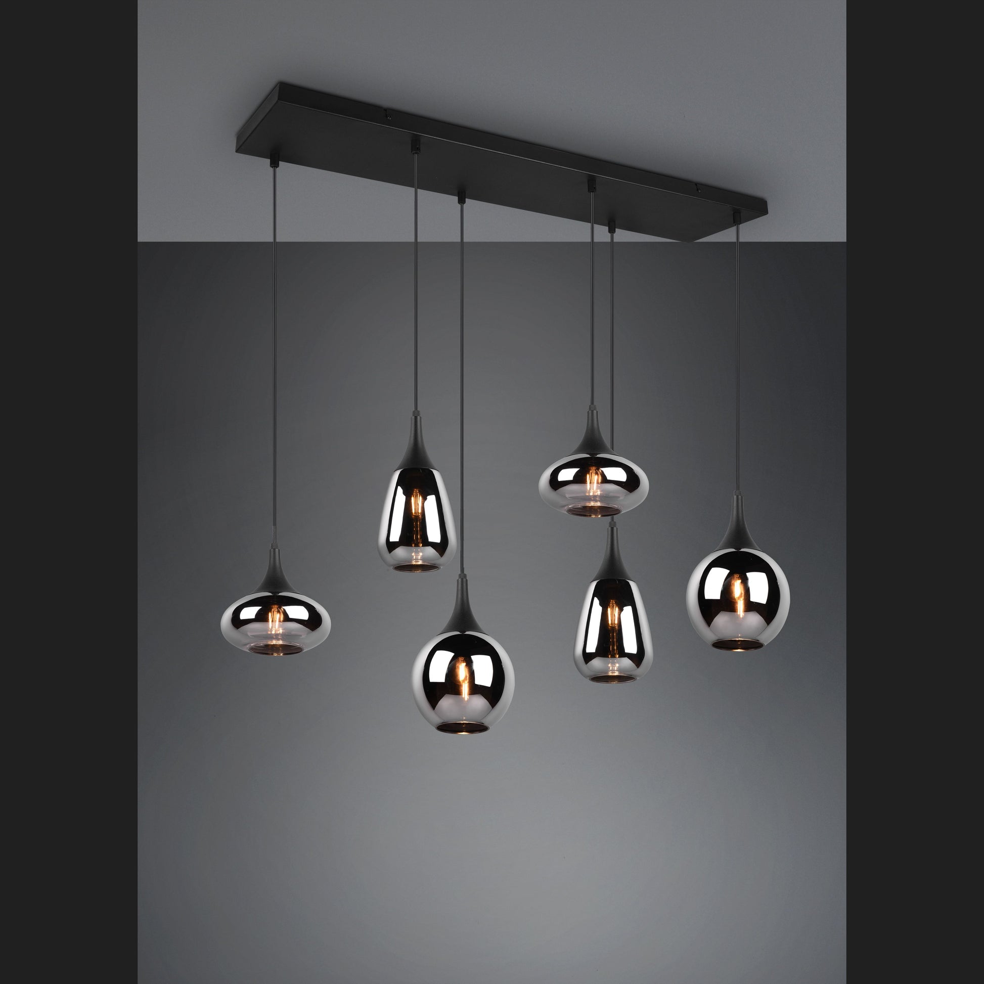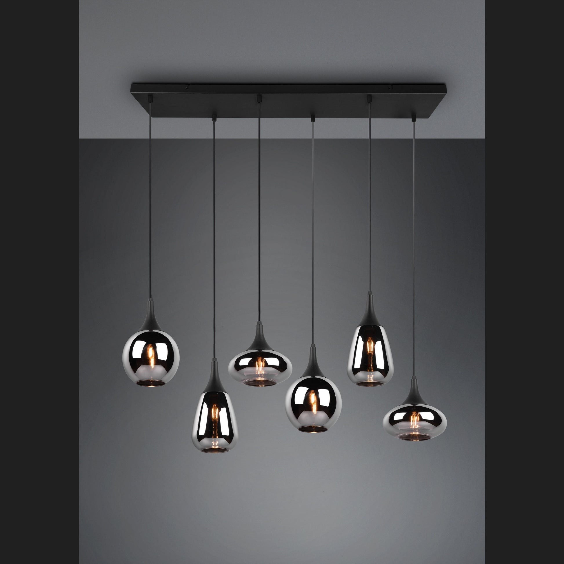 The LUMINA pendant luminaire is a special eye-catcher in your living area thanks to the noble glass shades! The different shapes of the six shades and the composition of metal and glass create a beautiful and unique light atmosphere and breathe a modern touch into your dining area. Thanks to the colour design in matt black and the glass shades in steamed chrome, there is plenty of scope for other colour shades, making it wonderfully easy to integrate into existing living concepts. For energy-saving lighting, it is recommended to use an LED illuminant. These are an optimal alternative to conventional halogen lamps and stand for a high quality of light and energy savings of up to 80%. In addition, LED lamps help you benefit from a long service life, low heat generation and at the same time protect the environment.