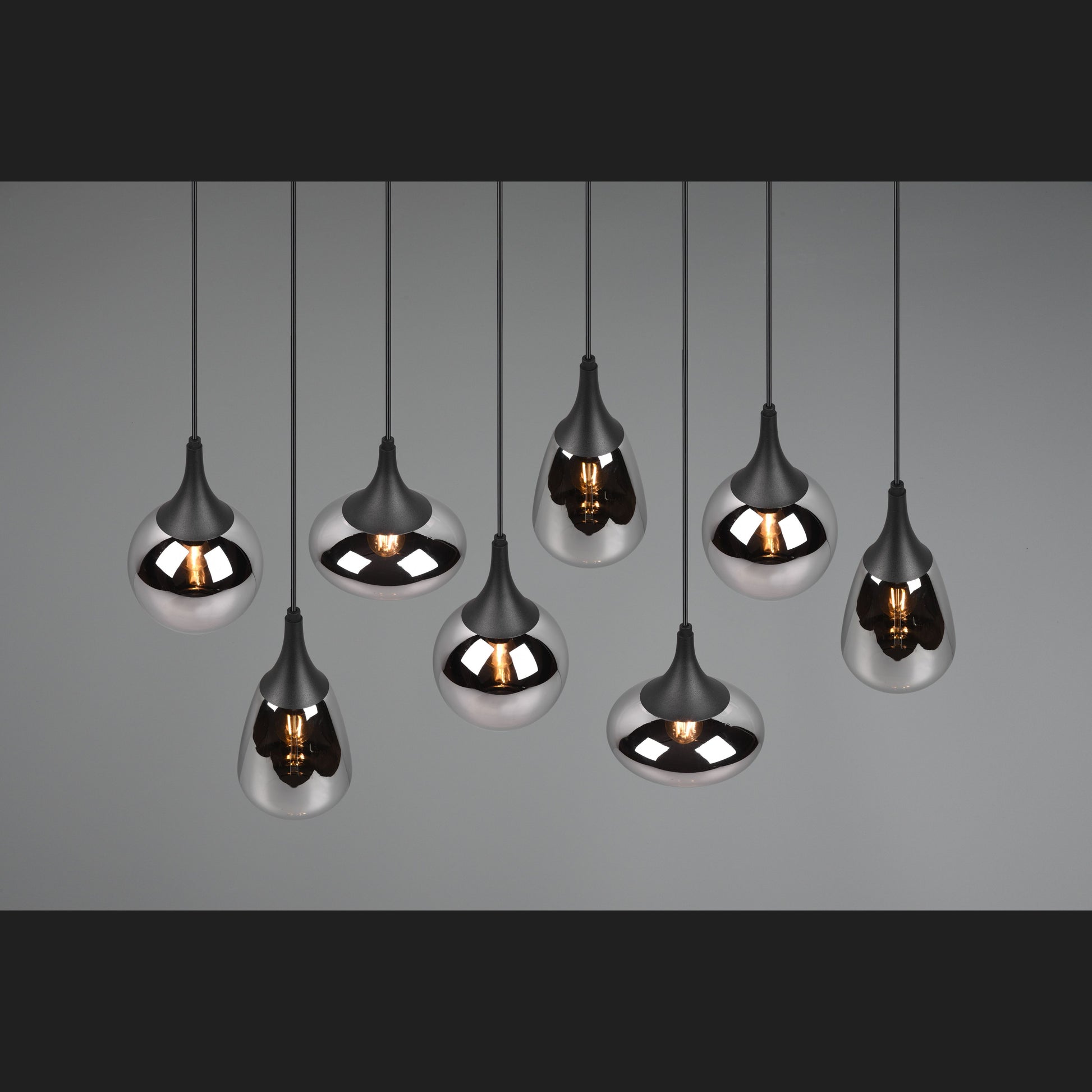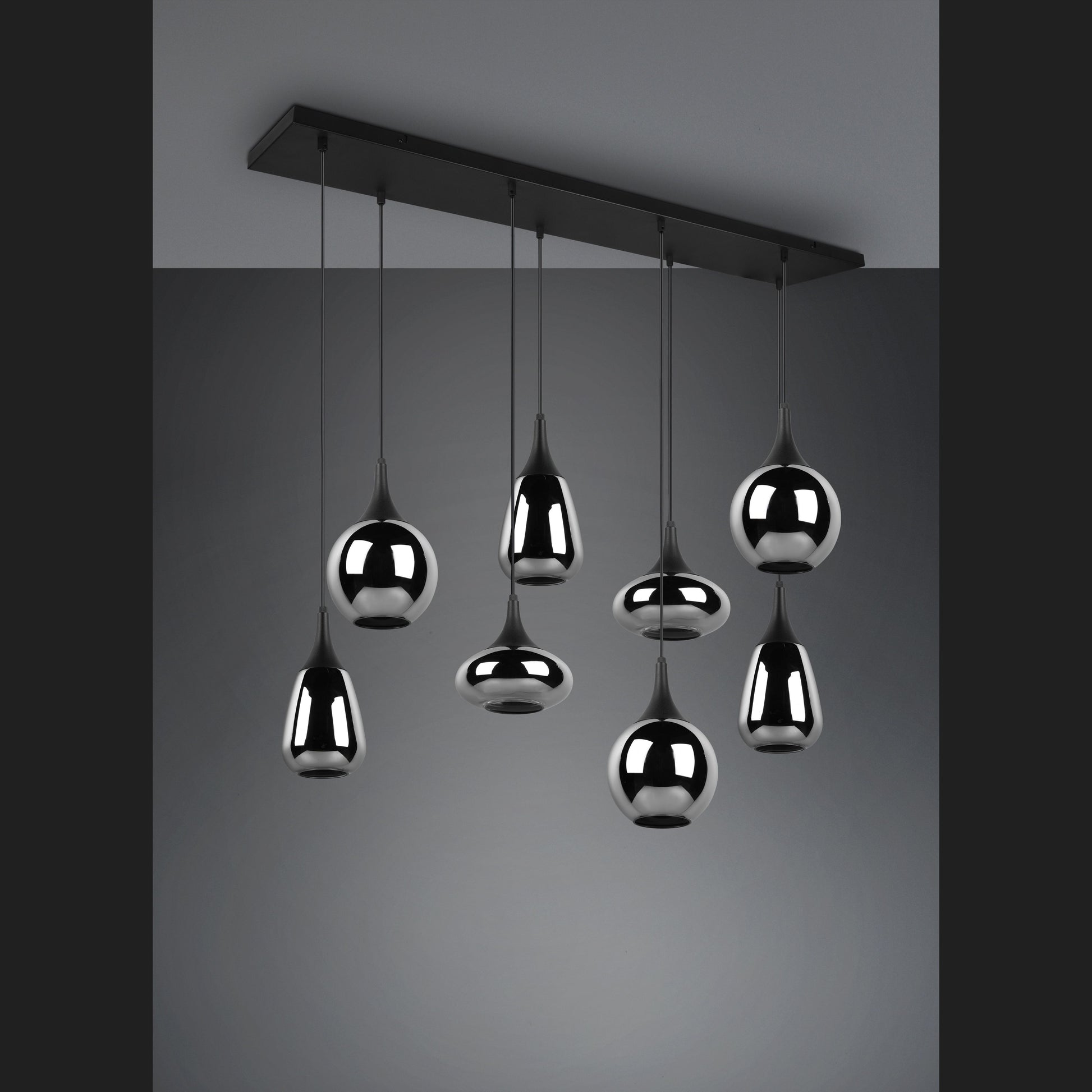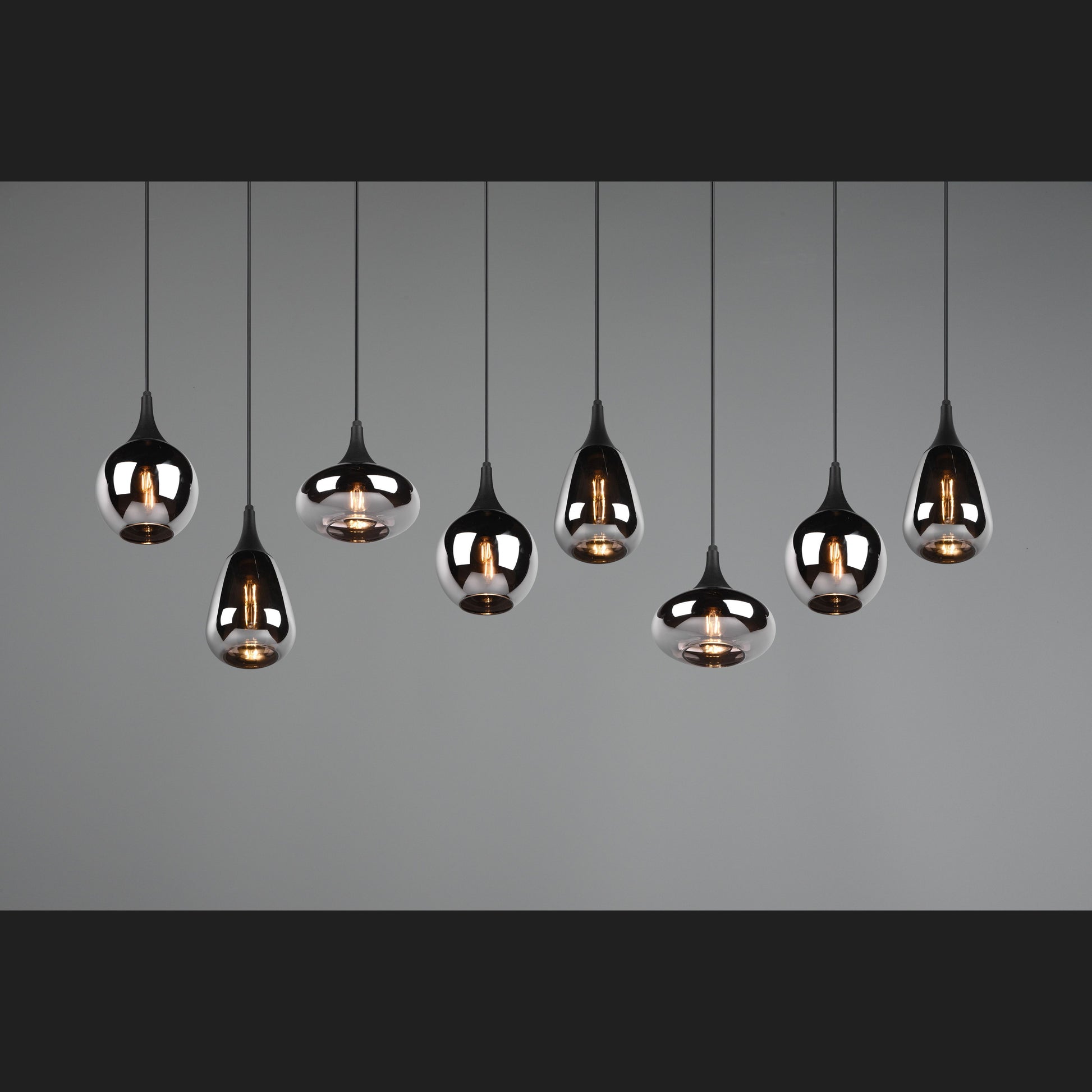 The LUMINA pendant luminaire is a special eye-catcher in your living area thanks to the noble glass shades! The different shapes of the eight shades and the composition of metal and glass create a beautiful and unique light atmosphere and breathe a modern touch into your dining area. Thanks to the colour design in matt black and the glass shades in steamed chrome, there is plenty of scope for other colour shades, making it wonderfully easy to integrate into existing living concepts. For energy-saving lighting, it is recommended to use an LED illuminant. These are an optimal alternative to conventional halogen lamps and stand for a high quality of light and energy savings of up to 80%. In addition, LED lamps help you benefit from a long service life, low heat generation and at the same time protect the environment.