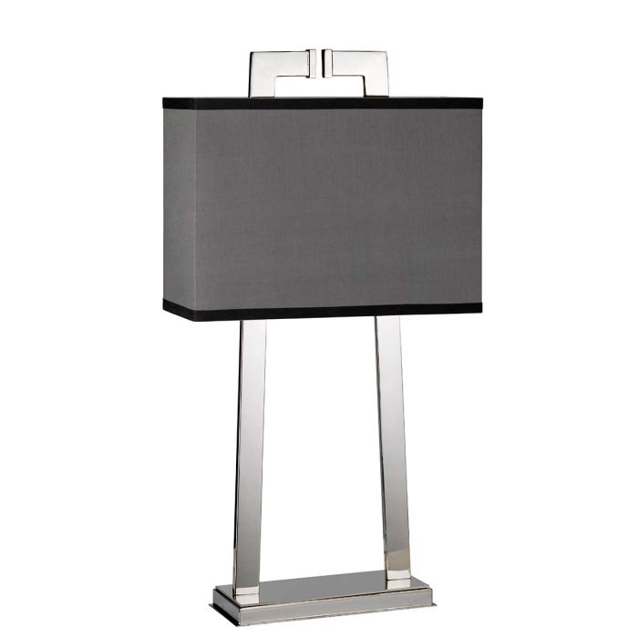 The Magro portable table lamp is a simple architectural Polished Nickel base with a Light Grey polycotton shade and a Dark Grey trim. LS466