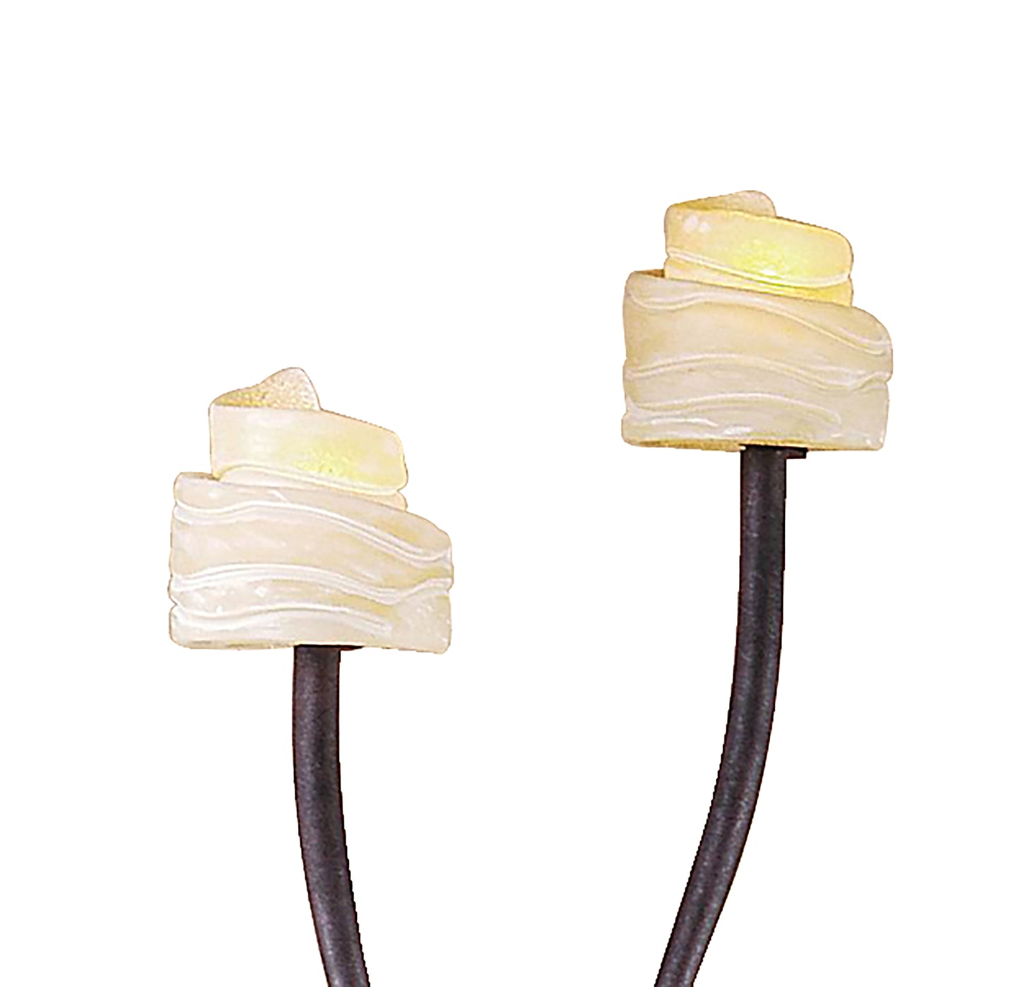 A selection of robust frames painted in a brown/black oxide finish, complimented with large hand made amber glass shades. The ribbon like metalwork is just one of the minor details that makes this collection timeless. With E14 lamp holders, this means low energy lamps can also be used in the products.