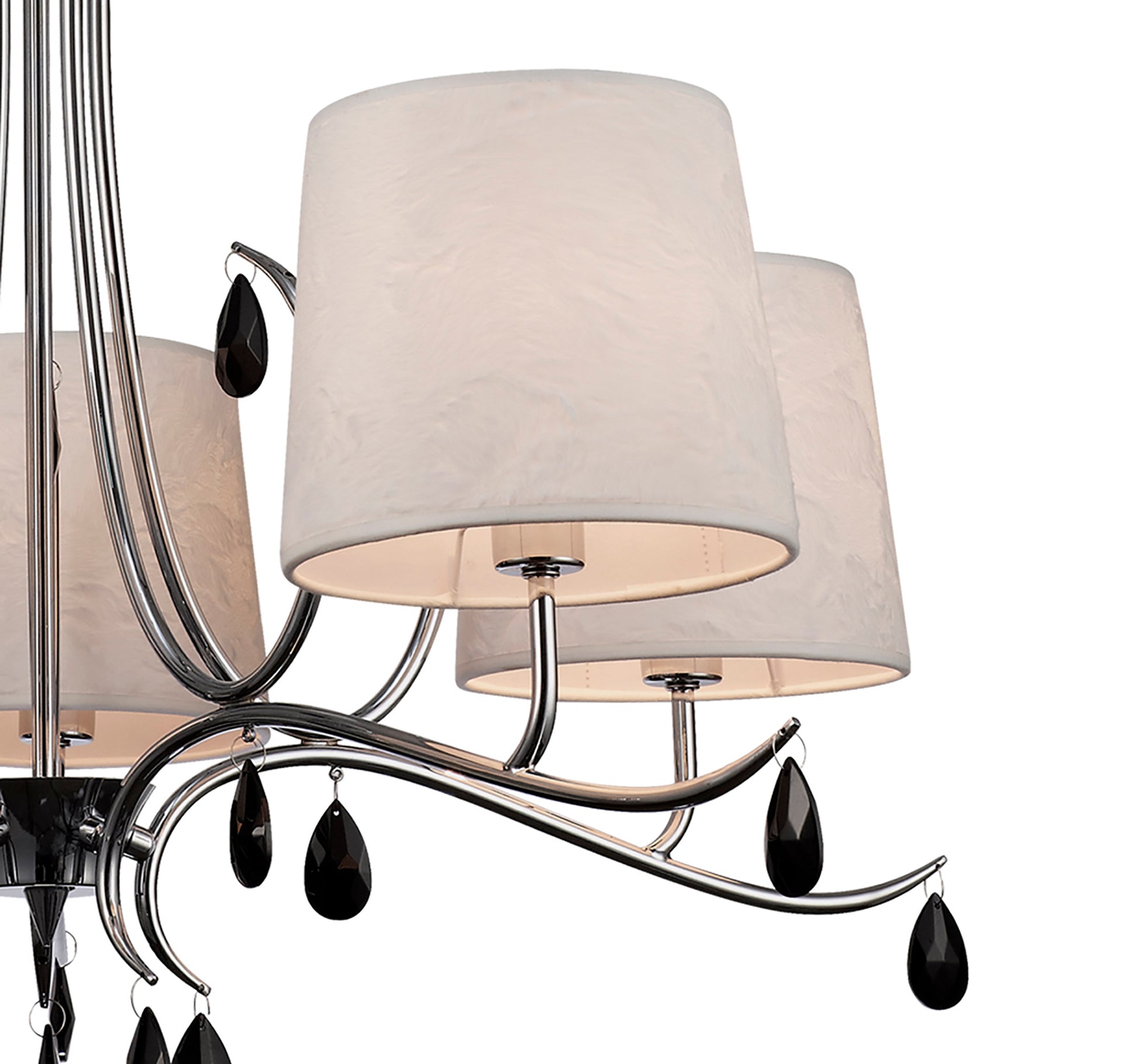 Andrea Pendant 81.5cm Round, 5 x E14 (Max 20W), Polished Chrome, White Shades, Black Crystal Droplets by Mantra