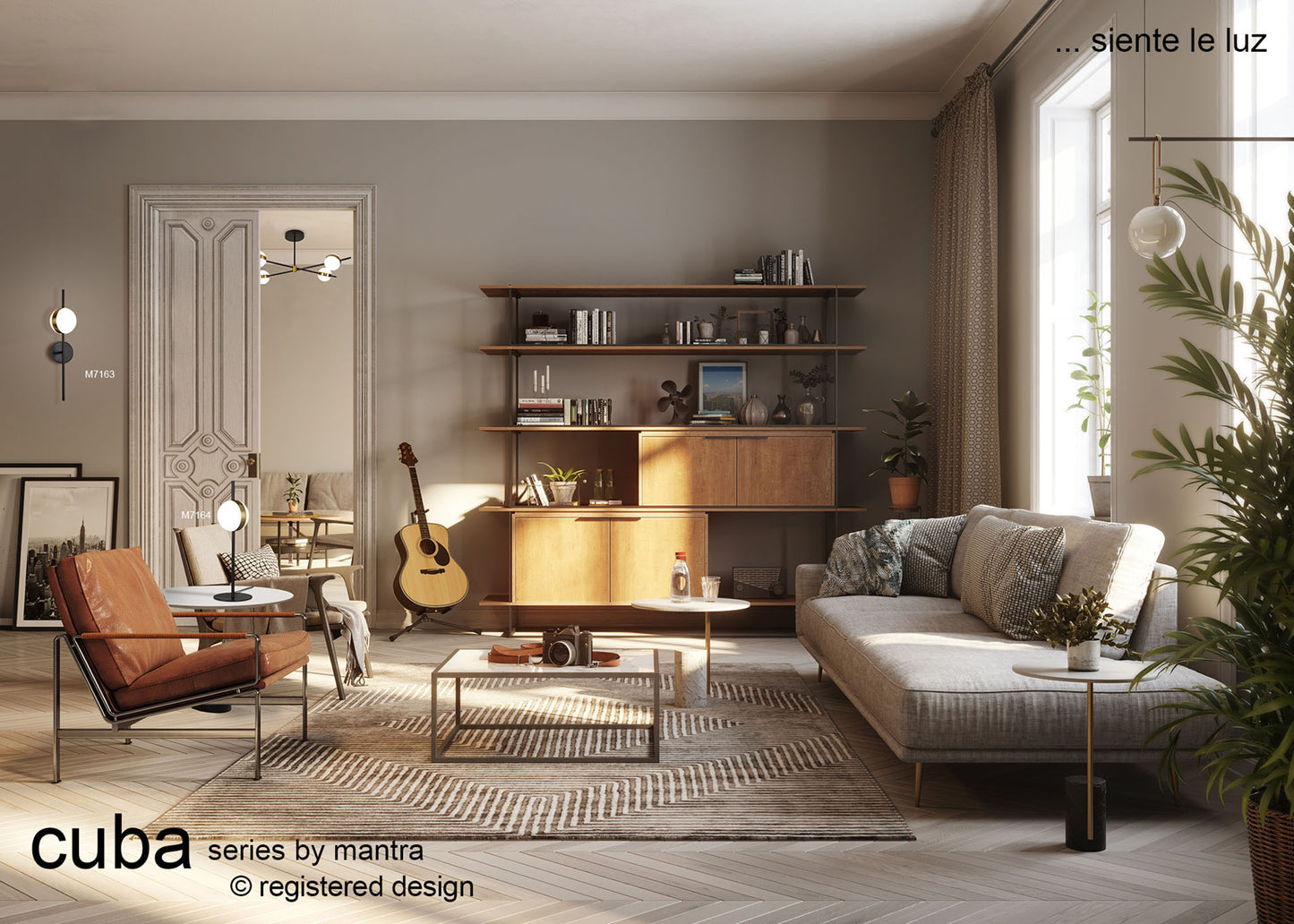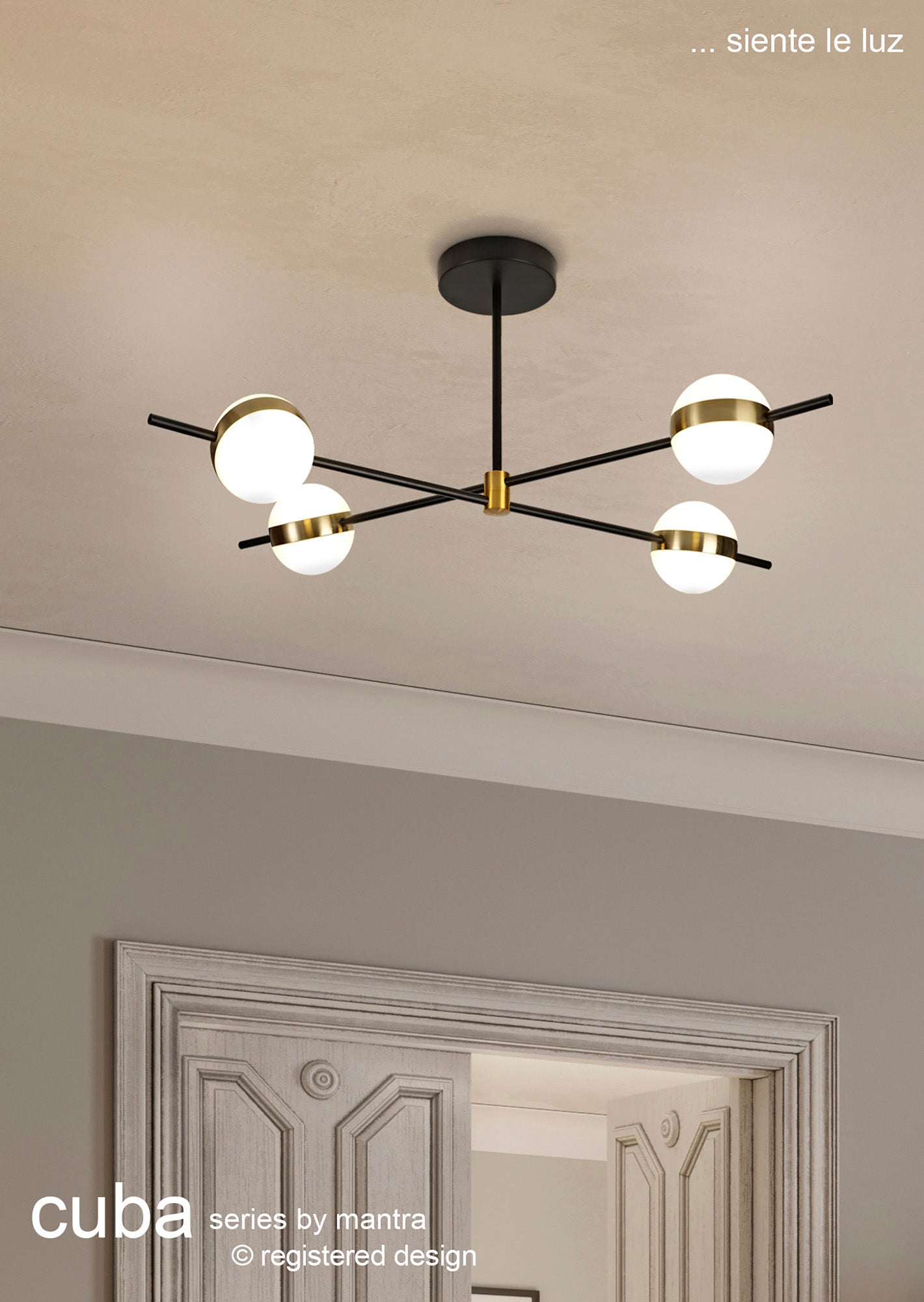 Cuba's combination of black and gold colour finishes devise an art deco theme applied to a modern design with state of the art LED technology, providing a stylish yet energy saving lighting solution. The inventive formats of round shapes along slim frames ensure the round light sources are the most eye-catching feature of this striking collection comprised of two pendants, a semi-flush ceiling, wall and table lamp.