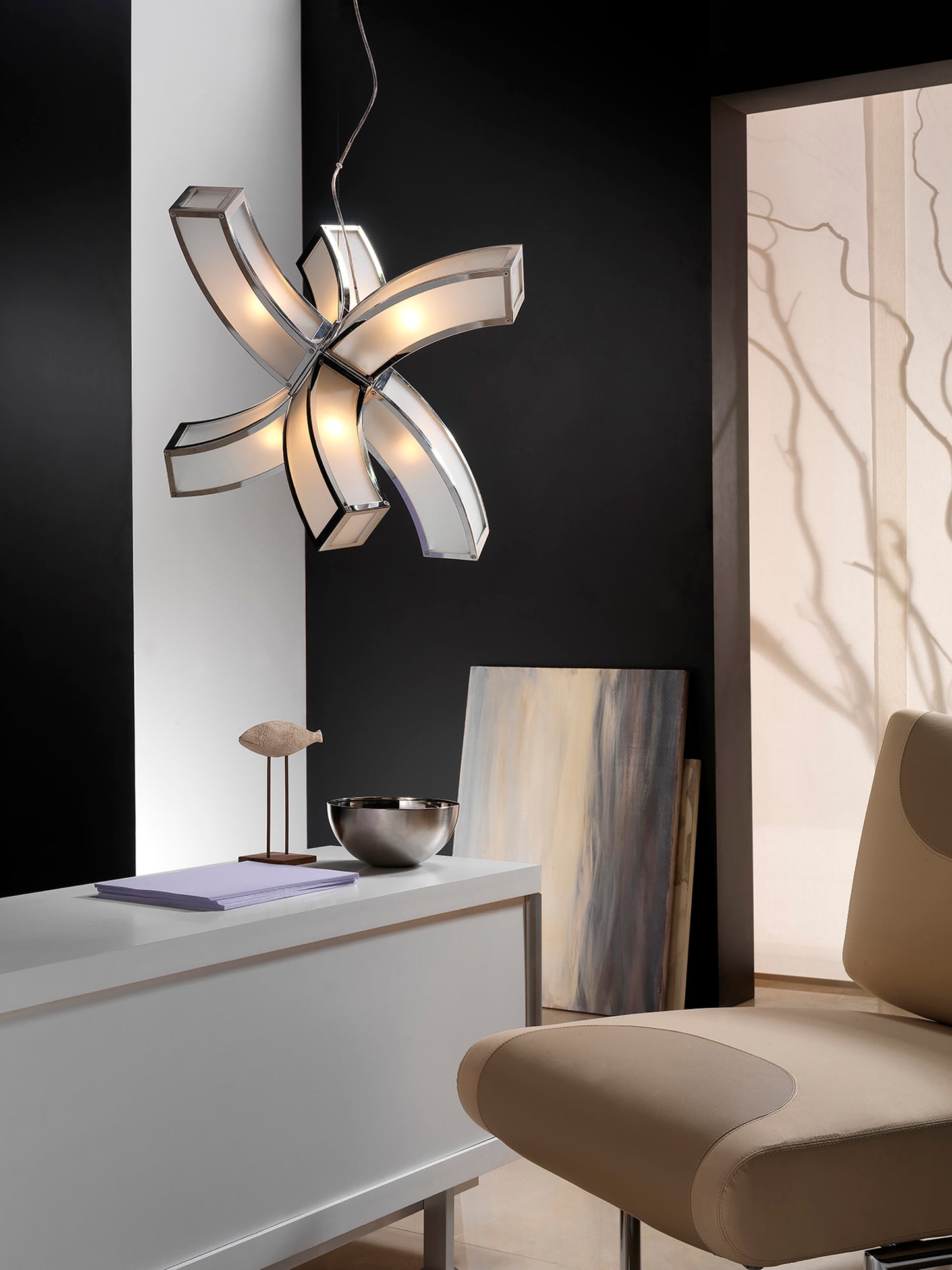 Duna E27 Pendant 6 arms 6 Light E27, Polished Chrome/White Acrylic, CFL Lamps INCLUDED by Mantra