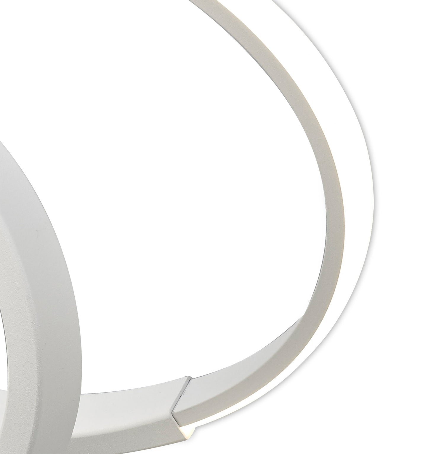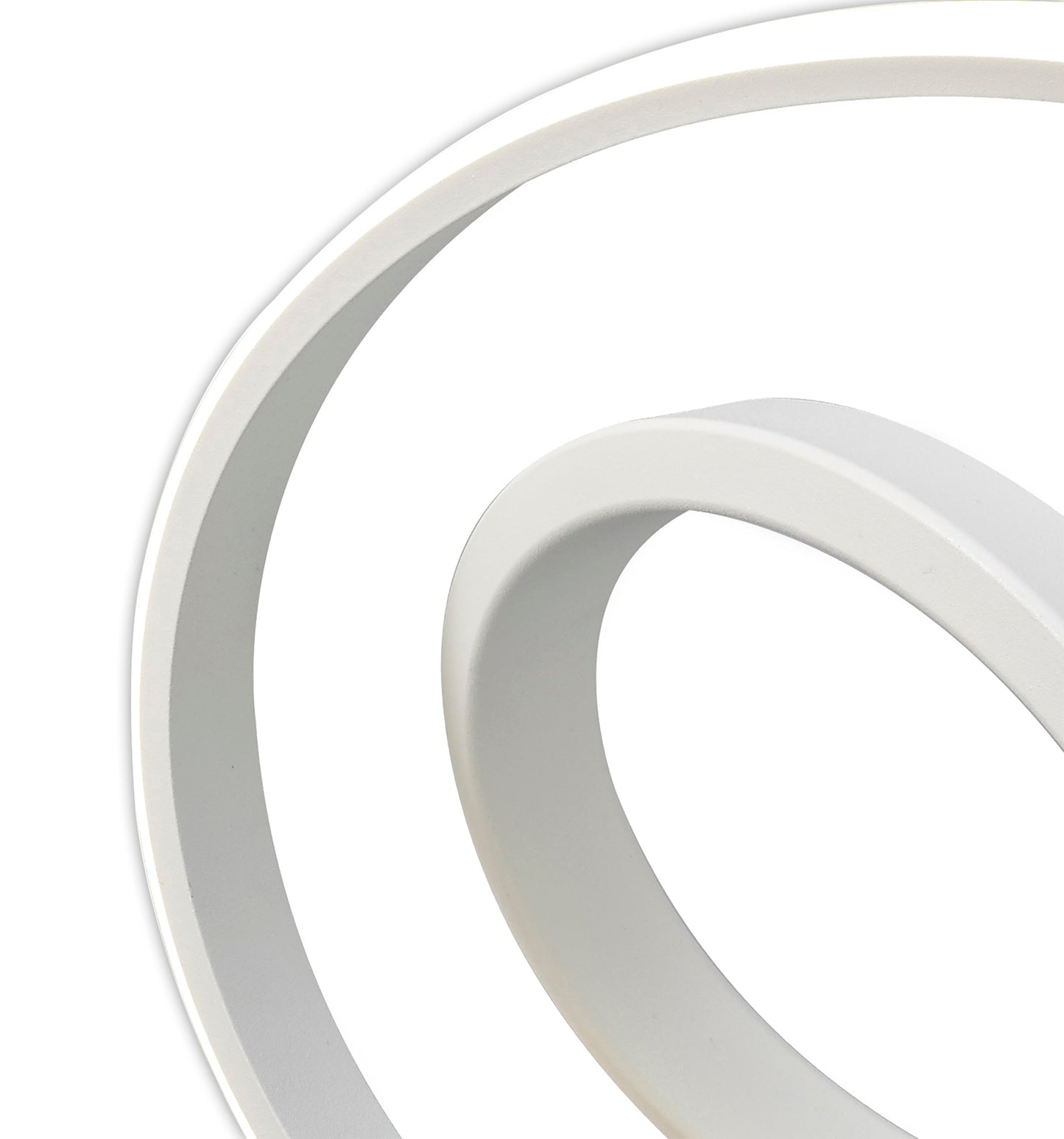 Infinity Blanco provides a neutral modern finish to the Infinity collection. Infinity artistically displays a smooth and uniform line of light without a beginning or an end in this original design by Jose Ignacio Ballester. The similar combination of white framework and frosted polycarbonate diffuser produces a subtle blended image of the curves and turns which mimic the shape and movement of rhythmic ribbons. This integral LED collection produces either a 2800K or 4000K light output to compliment the classic adaptable colour finish. The range consists of pendant and flush ceiling lights as well as an impressive looped table lamp. The flush version boasts a mirror back plate which simply doubles the impact of the design and light emitted. A number of items are also available in dimmable versions.