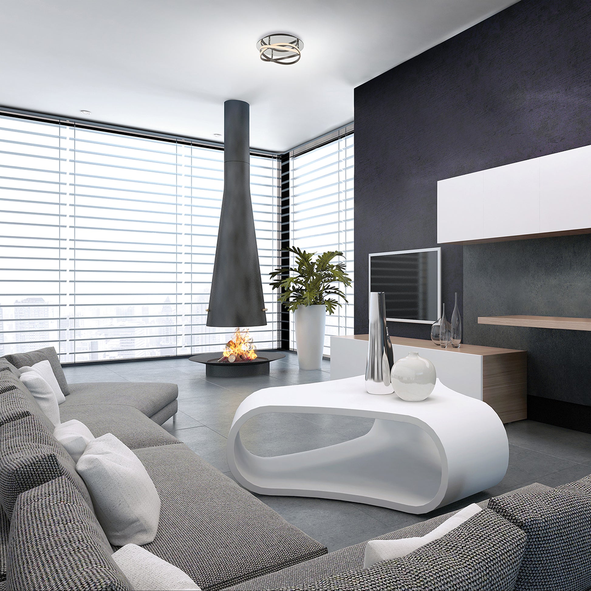 Infinity Brown Oxide offers a rustic finish to the Infinity collection. Infinity artistically displays a smooth and uniform line of light without a beginning or an end in this original design by Jose Ignacio Ballester. The contrasting combination of brown oxide framework and frosted polycarbonate diffuser produces a better realisation of the curves and turns which mimic the shape and movement of rhythmic ribbons. This integral LED collection produces a warm white (2800K) light output to compliment the more classic colour finish. The range consists of pendant and flush ceiling lights as well as an impressive looped table lamp. The flush version boasts a mirror back plate which simply doubles the impact of the design. Several items are also available in dimmable versions.