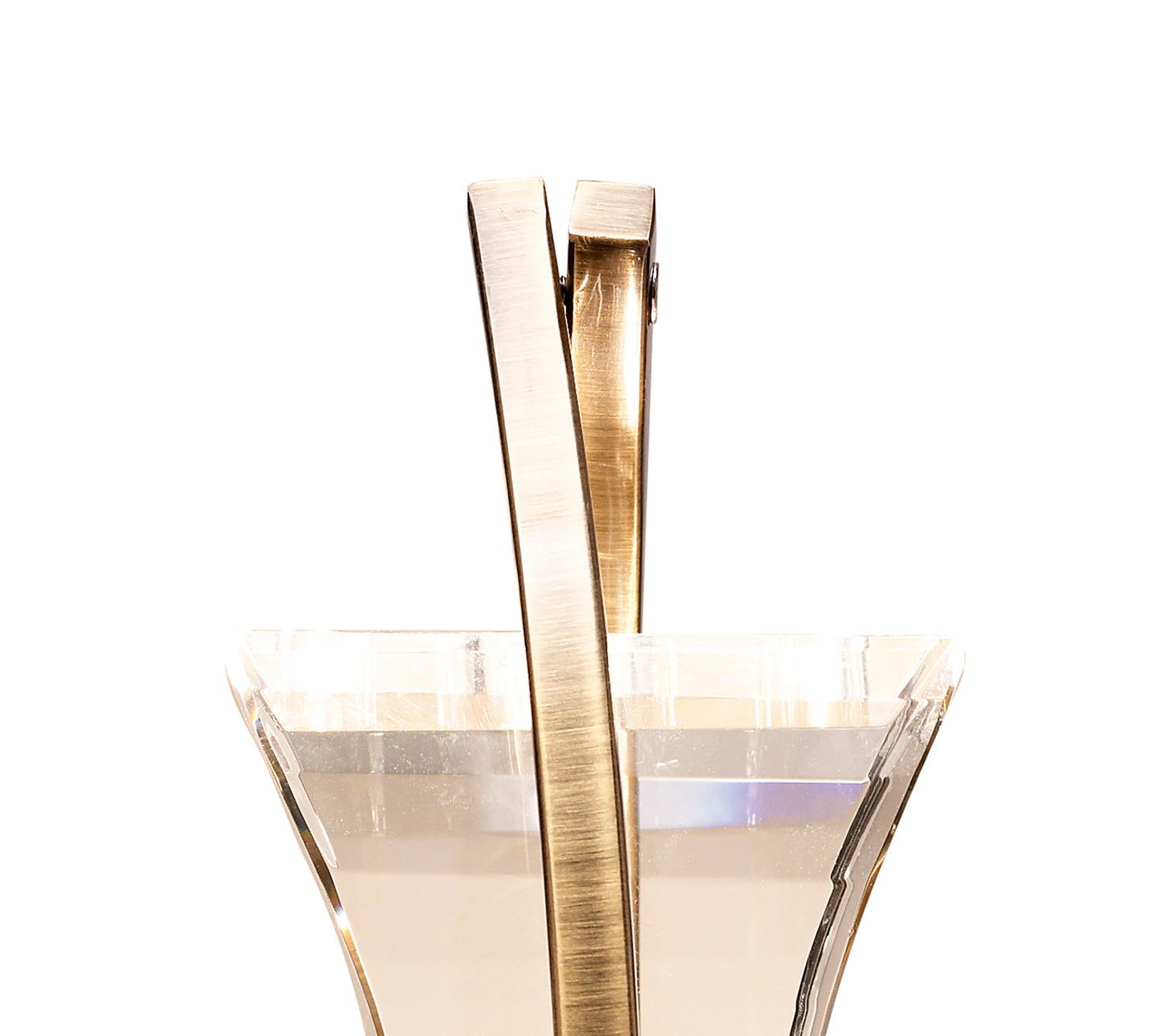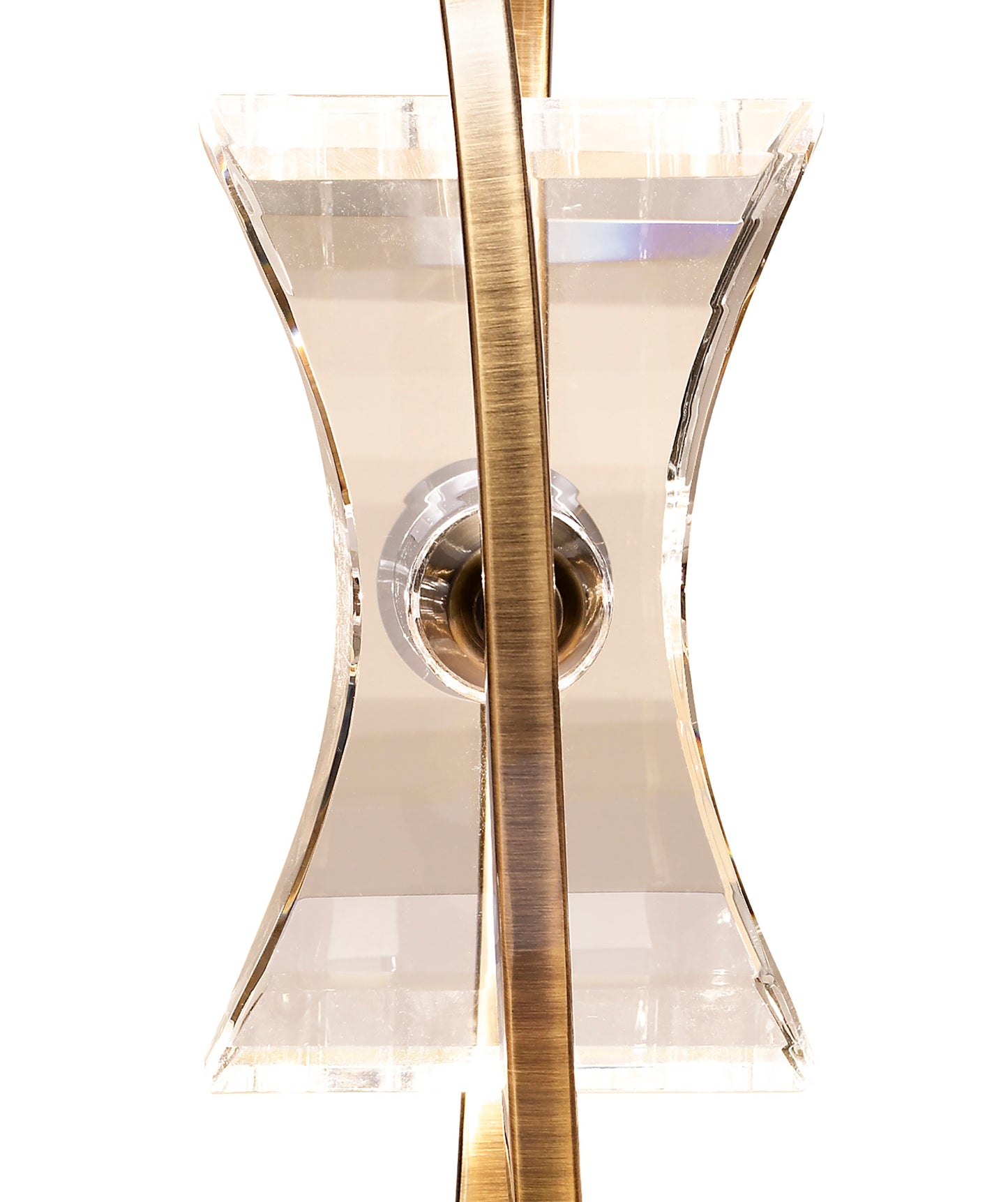 Kromo houses a substantial original block of multi faceted optical glass, carved into a curved shape which creates an explosion of light and a spectrum of colour. The collection is supported with a succession of sinuous curves that coordinate a polished chrome or antique brass frame around each shade. The floor lamp in this collection is outstanding as its two outer frames intertwist to create seven oval frames. Kromo is concise and dramatic without being ostentatious.