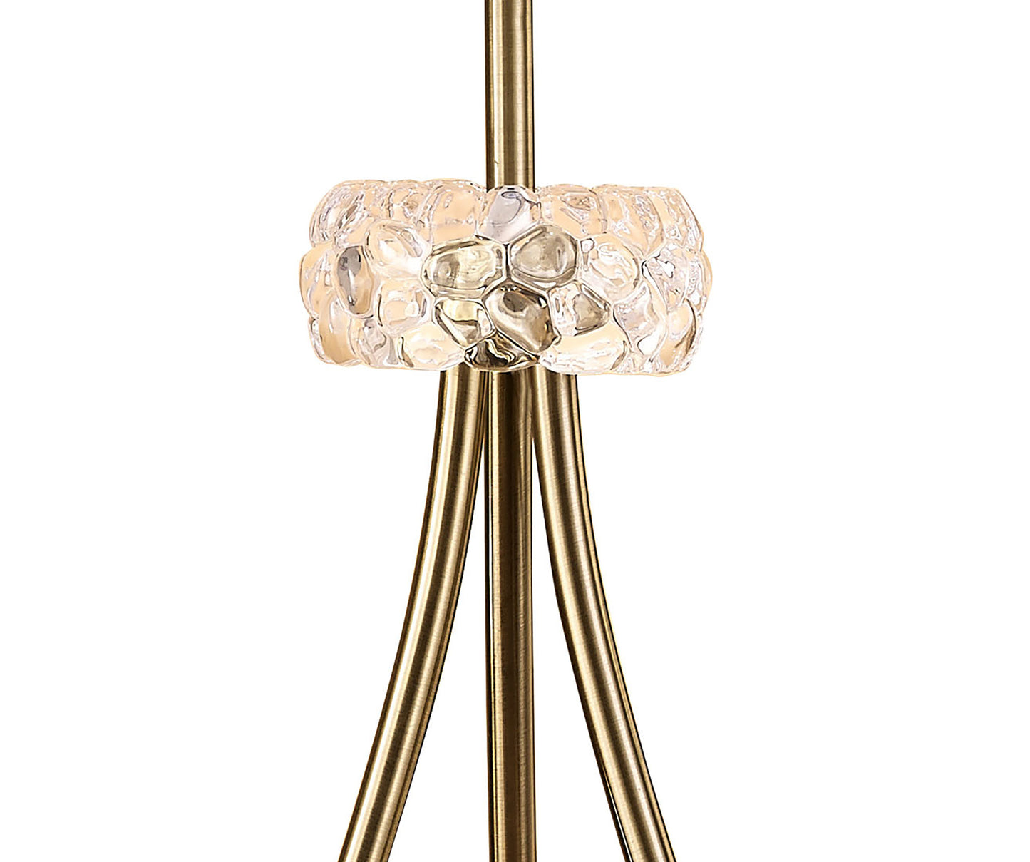 Loewe collection is a mixture of gentle and simple stroke arms that amalgamate in the centre behind the unique details of a large bubbled shaped glass. Each arm also effortlessly combines the dynamic shape of the bubble glass sconces with the elegant white organza shades. The arms are artistic strokes of polished chrome that vary in diameter, subtly defining the grace of this design. The full range is also available in antique brass which is complimented with cream organza shades for a warmer effect. The floor lamp also has a particularly unique design as it poises on three legs. Loewe is the epitome of refined lighting.