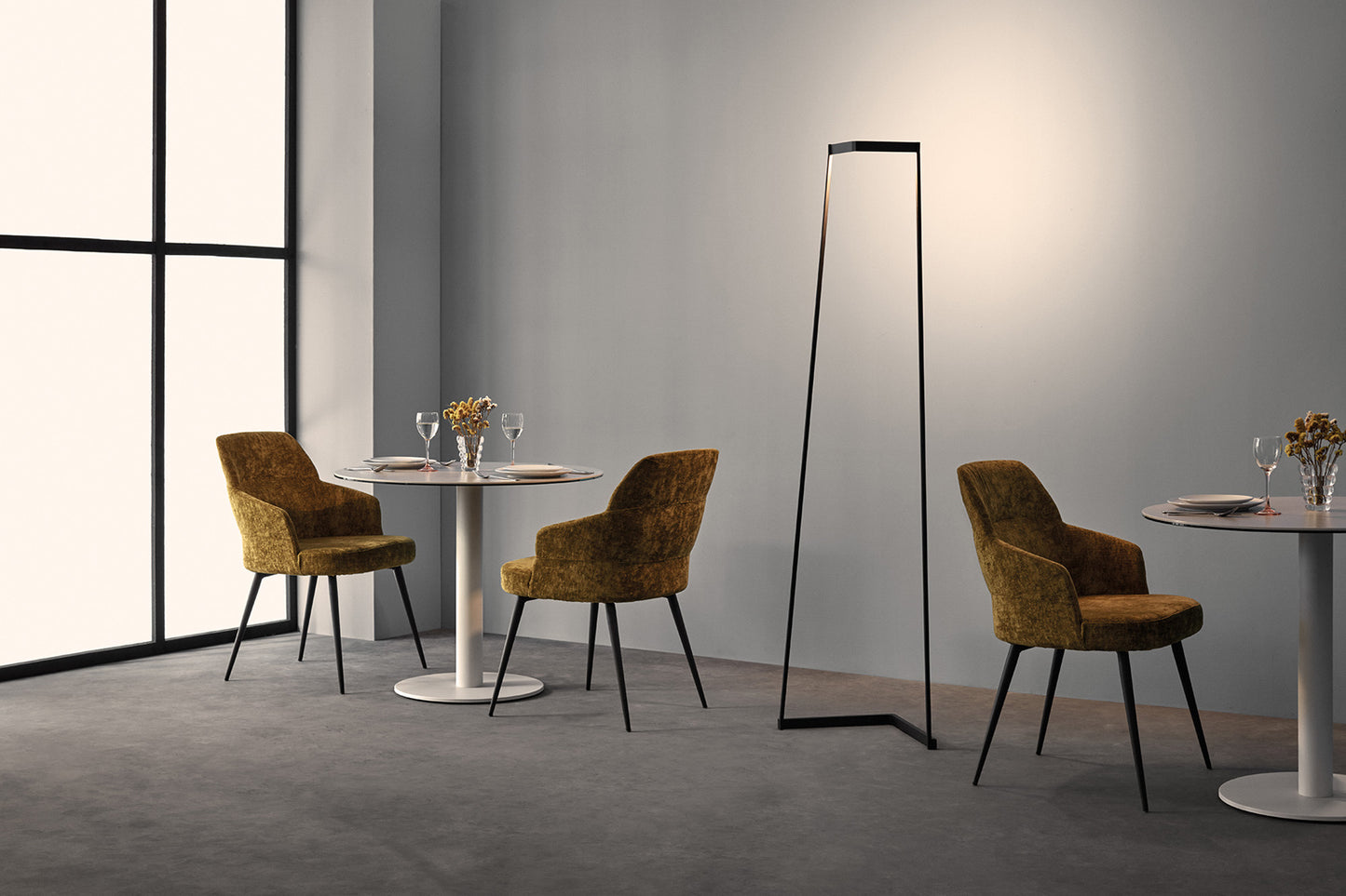 Minimal in name and by nature, this collection of table and floor lamps use a simple open framework that forms the base and stand leading to the LED head. Available in various colour finishes, this sleek design permits optimum illumination from the 3000K LEDs projected downwards through the open space.