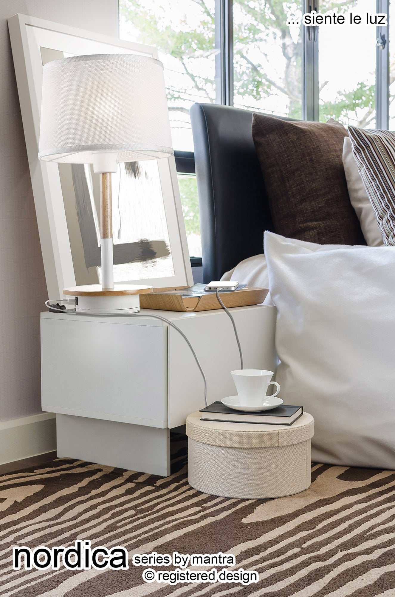 Nordica II is a prime example of how our designers continue to accommodate the needs of our consumers. This collection features the best of its designer ingenuity offering a table, floor, standard wall and LED reading wall lamp, all with a built in USB port and wooden beech ledges, making them ideal for charging portable devices. This added selection to the Nordica family also includes 5 and 3 light telescopic pendants and an extendable arm wall light, all with adjustable shades, suitable for evening studies or reading. These products continue to be perfectly balanced by a combination of white translucent shades, white metal hardware and a natural wooden structure. Technology and functionality merge with fabric shades and natural wood, the essence of Nordica II.