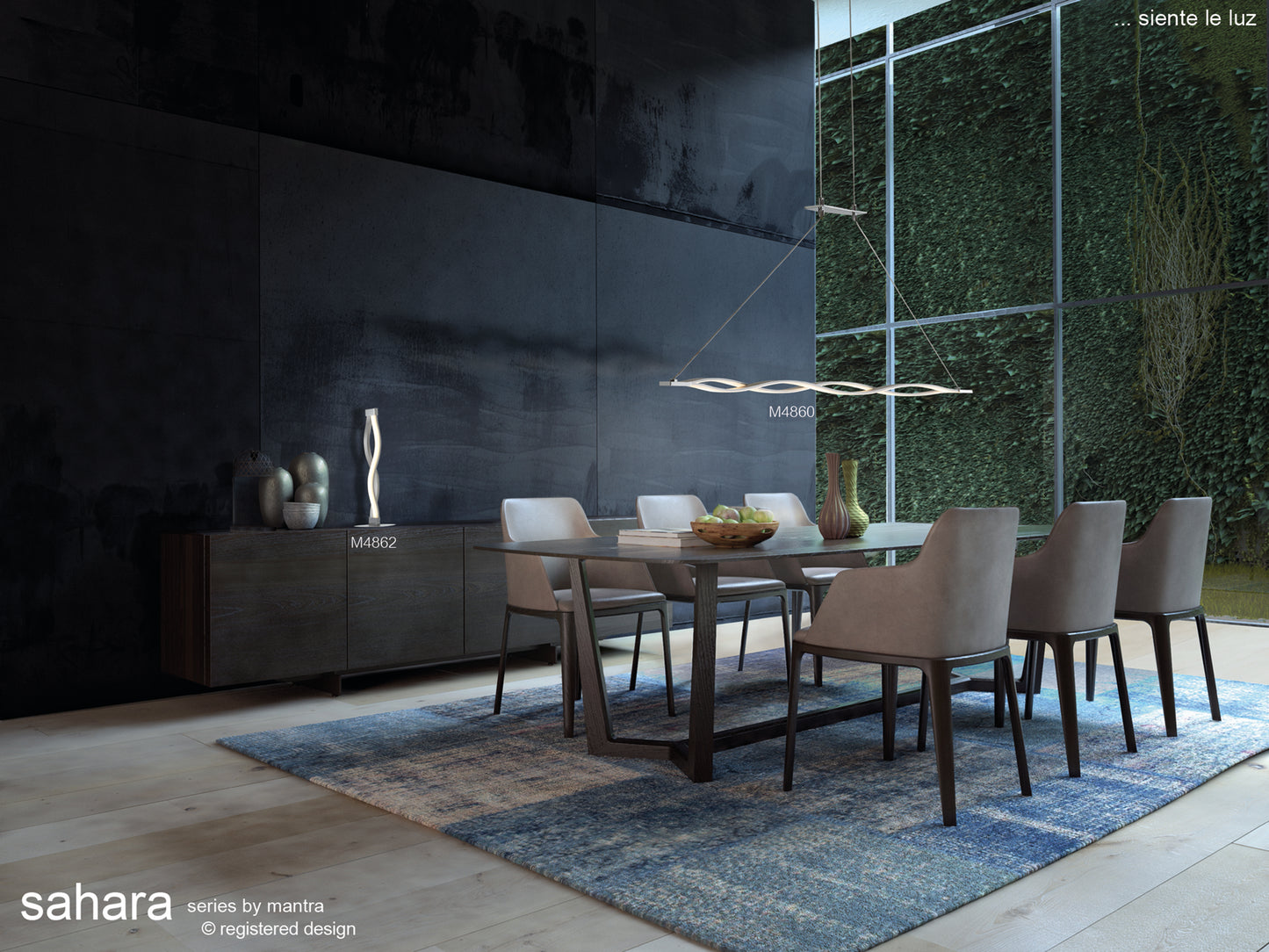 Sáhara is an artful display of alternating tendrils of polycarbonate diffusers and an aluminium frame. This creates an alluring light collection in its entirety. Its uncomplicated outline creates interesting shadows and an atmospheric ambience. The pendant and floor lamp are particularly stunning and would be a focal point in a modern space. The wall and table lamps perfectly balance the range as they are smaller but no less impressive in design and quality. Sáhara has skilfully interpreted the soft sand dunes of the Sáhara and successfully blended them with Mantra's signature aesthetics and a crisp white (3000K) light output. Several items are also available in dimmable versions.
