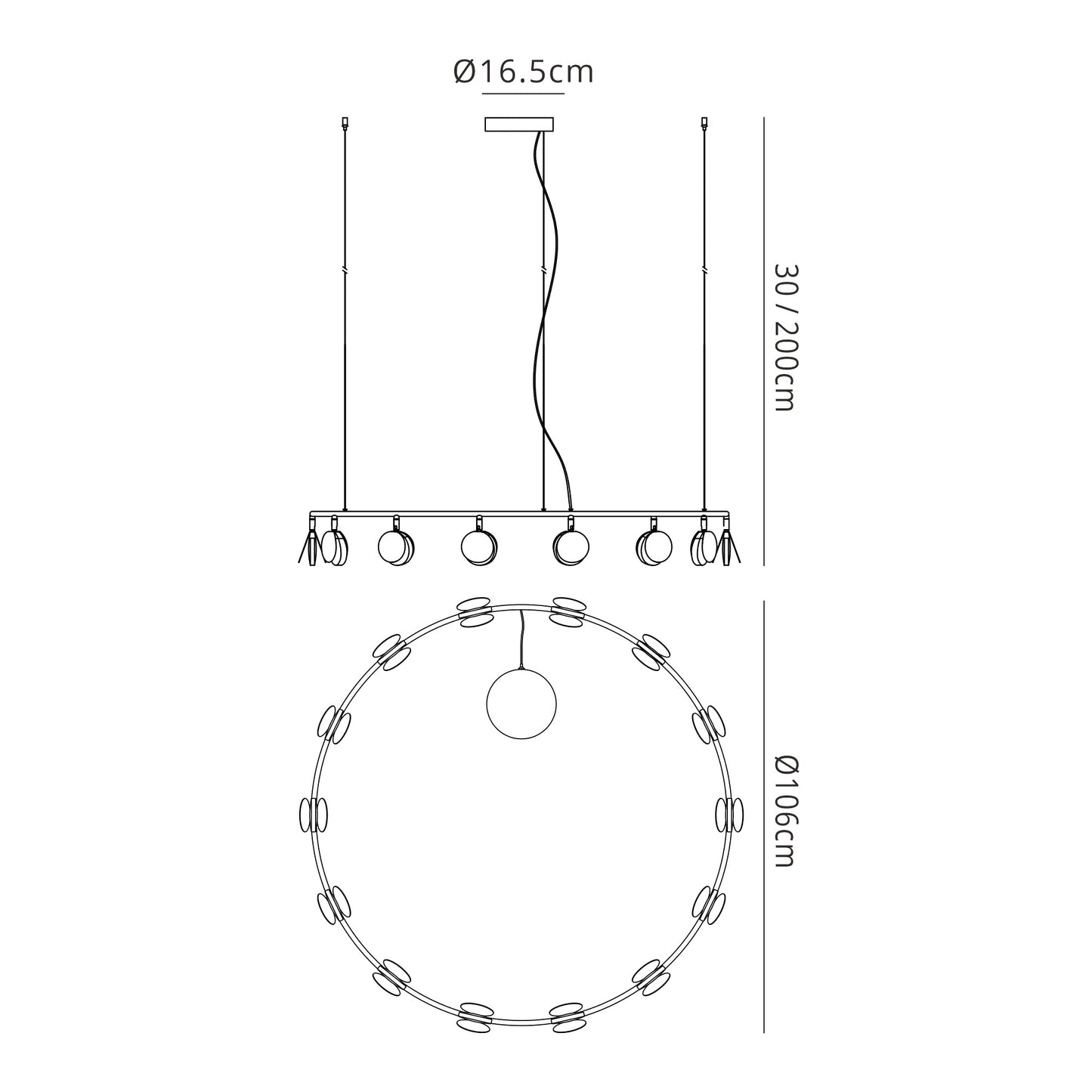 Mantra’s Shell range hosts a fountain of attractive key features the main focus of which is adaptability. The stunning gold framework accentuates the integral 3000K LEDs each situated within a number of round disks. Each LED head has an adjustable directionality making the halo shape of the frames appear more like stage lights. The central ceiling plates are unassuming and direct the electrical wire whilst the suspension cables instead can be fixed in multiple positions along the ceiling offering a wider range of compositional design. This concept, new to the market, is untraditional and intriguing.