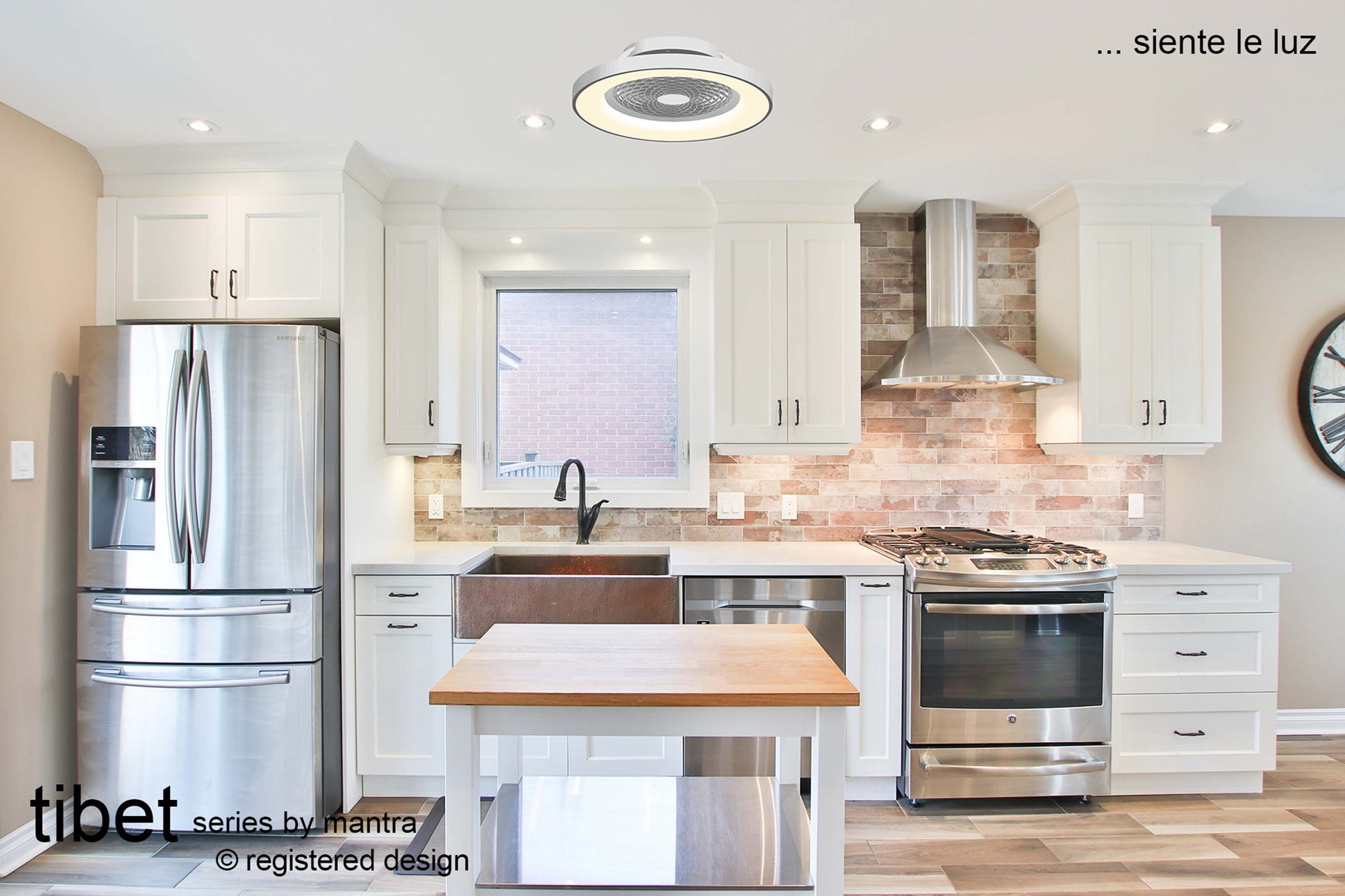 In the wake of the unfathomable response the Aliso range received, Mantra have expanded on their one of a kind concept of ventilation lighting with this new design. Offering an alternative aesthetic, 70W LEDs are housed within a diffuser which halos the central fan blades. The 30W fan is fitted behind a grid like cover with an intricate optical illusion cut-out pattern. This range's ability to set different intensities and speeds, means it can be installed in larger areas, such as living rooms, kitchens or open offices. The dimmable colour temperatures and different DC motor speeds can both be controlled either by the remote supplied with the item, Bluetooth APP or Alexa and Google voice control. For further adaptation across alternative decorative motifs Tibet features four colour options; black, black/gold, white, silver and wood/white.