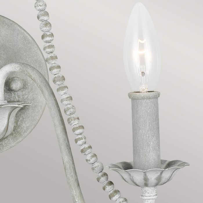 The 2lt Maryville wall light has soft feminine features in a French Country style. The floral inspired bobeches and delicate wood bead strands are all finished in a Weathered Washed Grey.