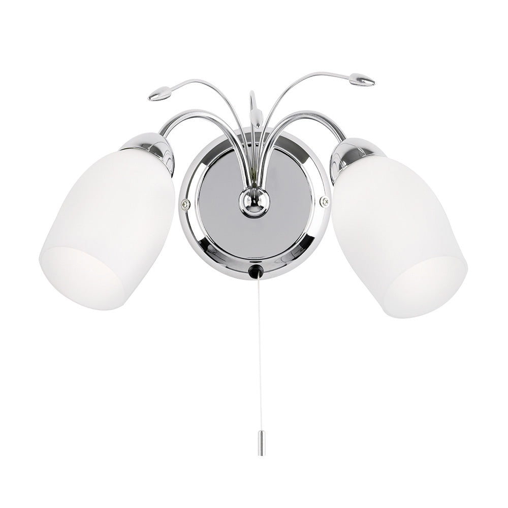 Twin wall light with down-facing opal glass shades, and finished in chrome effect plate. Supplied with pull cord switch. Dimmable and suitable for use with LED lamps. Matching items and other colour options available