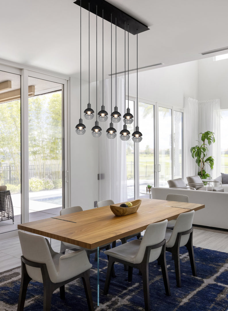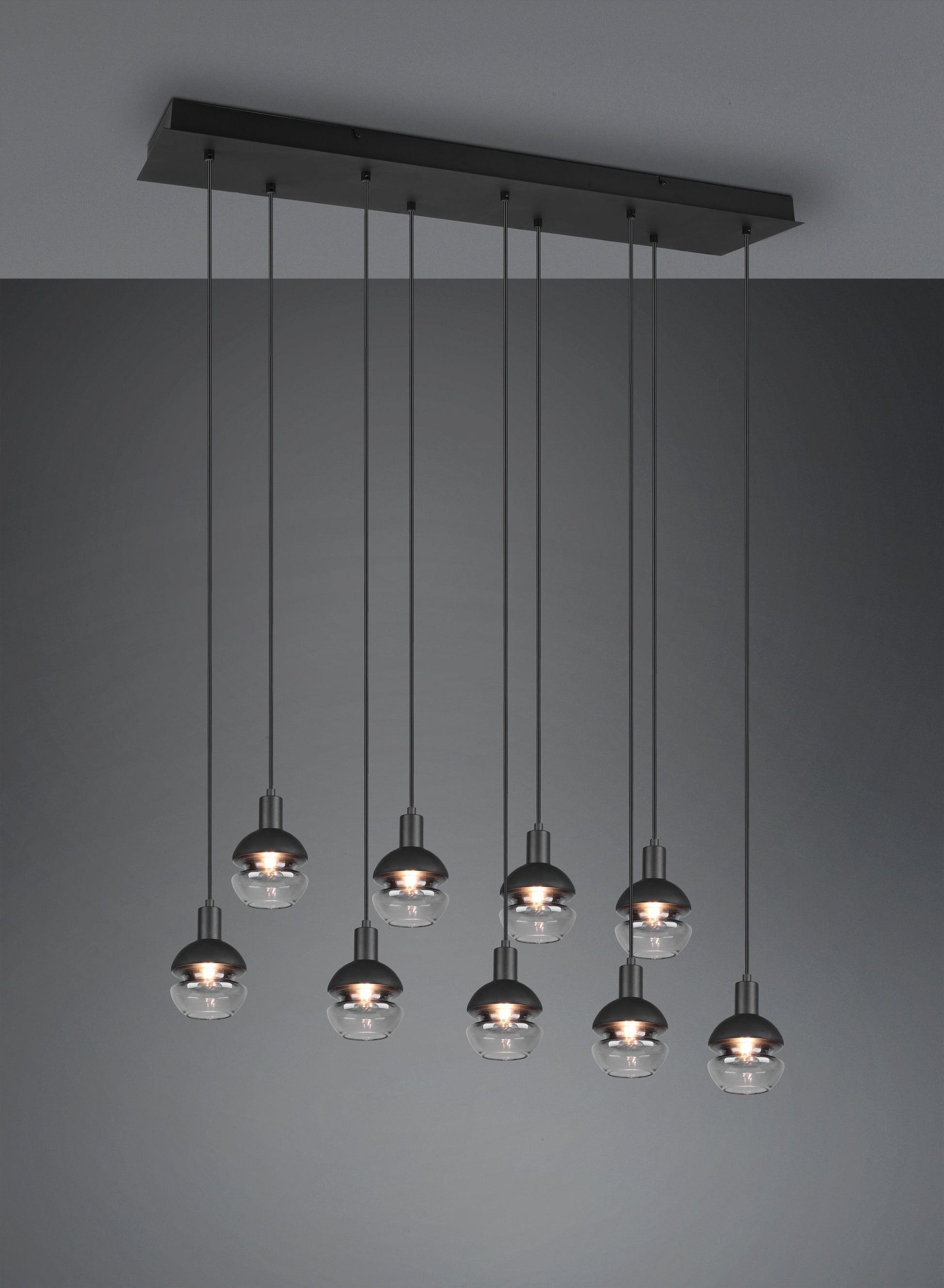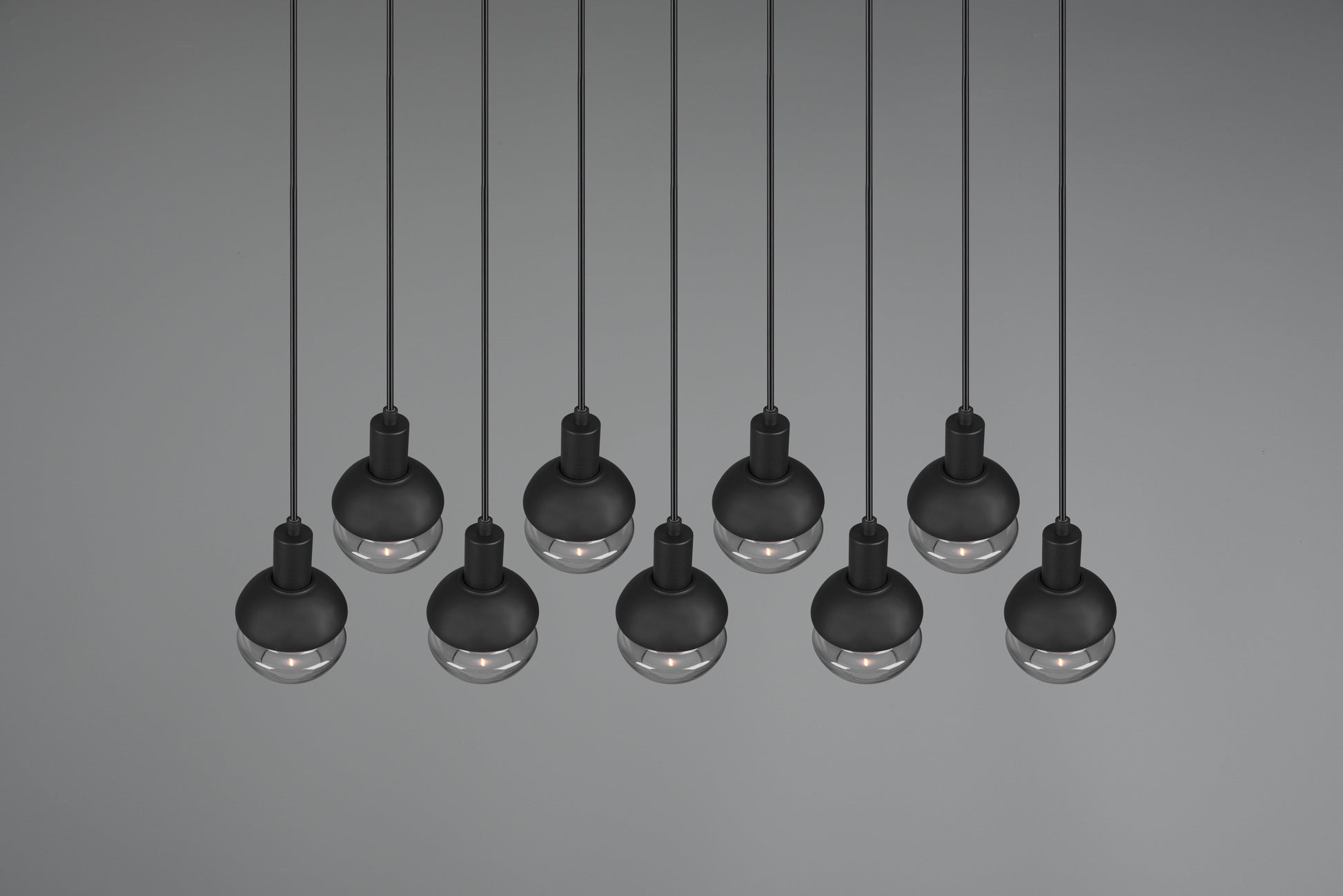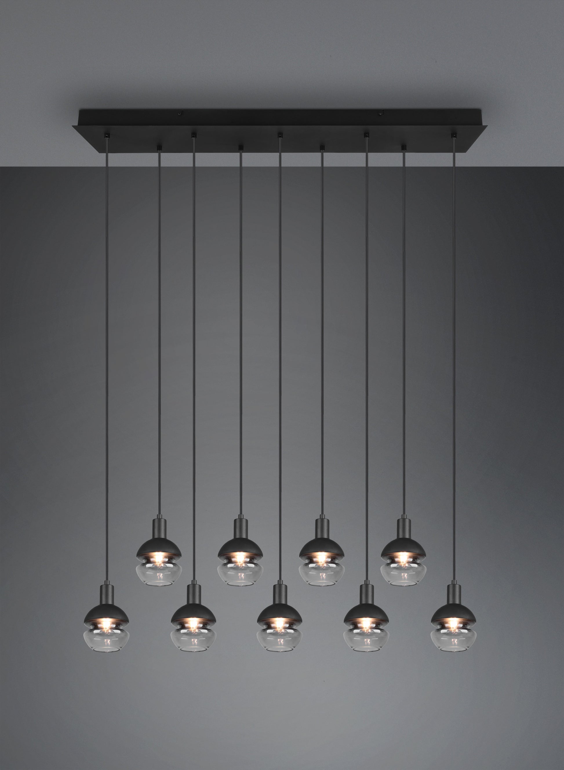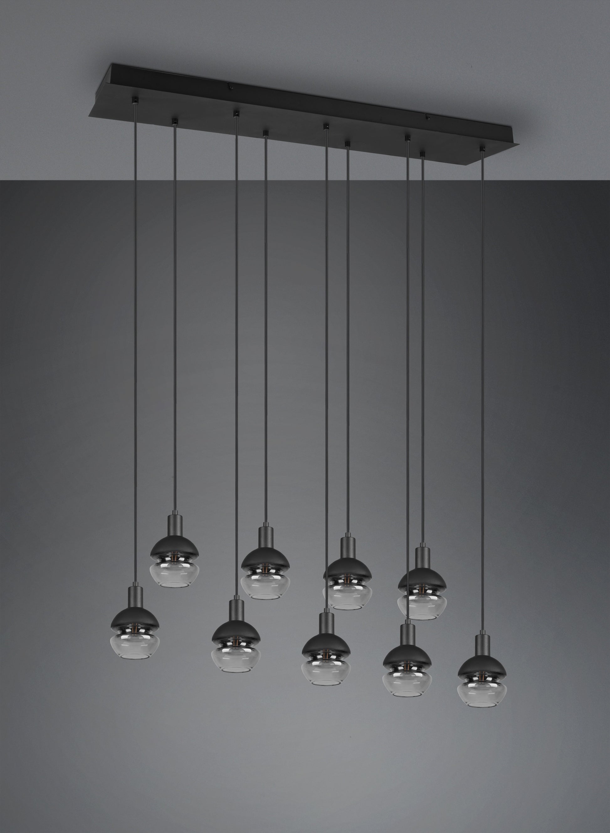 Simple and modern in design, the MELA pendant luminaire adapts to any style of living. The nine-flame pendant luminaire, mounted centrally above the dining table, becomes a real eye-catcher and provides optimal lighting conditions. Due to the futuristic shape of the glass shades, they emit the light in a special way to their surroundings and create cosy light accents. The timeless design in matt black and smoked glass leaves plenty of scope for other colour tones and makes it wonderfully easy to integrate into existing living concepts. For energy-saving lighting, it is recommended to use an LED illuminant. These are an optimal alternative to conventional halogen lamps and stand for a high quality of light and energy savings of up to 80%. In addition, LED lamps help you benefit from a long service life, low heat generation and at the same time protect the environment.